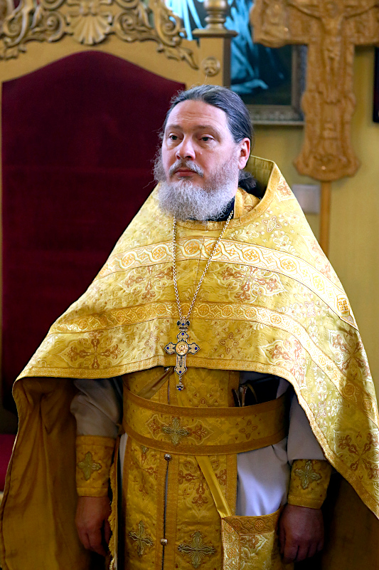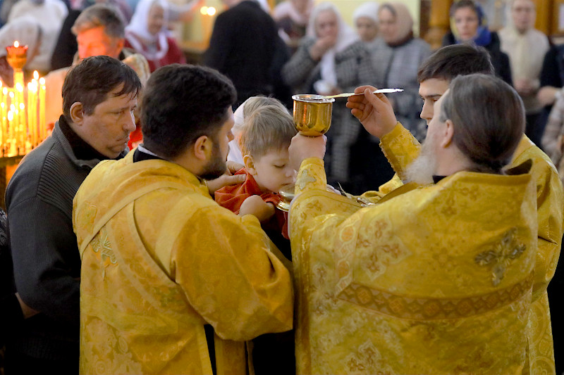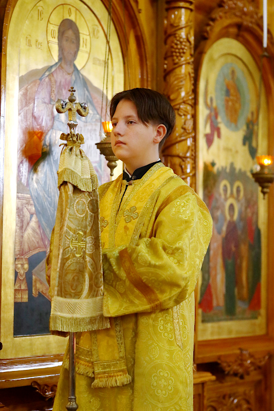 На Литургии было прочитано Воскресное Евангельское Зачало 38 от Луки: И приплыли в страну Гадаринскую, лежащую против Галилеи. Когда же вышел Он на берег, встретил Его один человек из города, одержимый бесами с давнего времени, и в одежду не одевавшийся, и живший не в доме, а в гробах. Он, увидев Иисуса, вскричал, пал пред Ним и громким голосом сказал: что Тебе до меня, Иисус, Сын Бога Всевышнего? умоляю Тебя, не мучь меня. Ибо Иисус повелел нечистому духу выйти из сего человека, потому что он долгое время мучил его, так что его связывали цепями и узами, сберегая его; но он разрывал узы и был гоним бесом в пустыни.