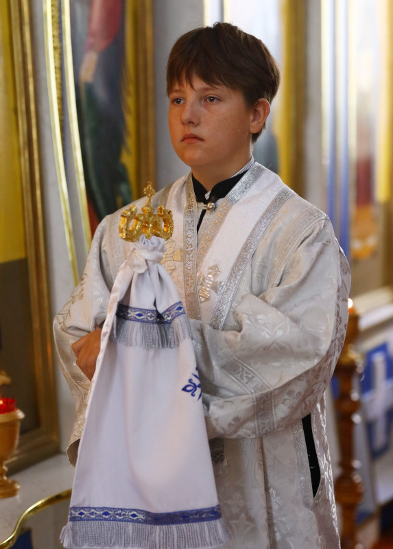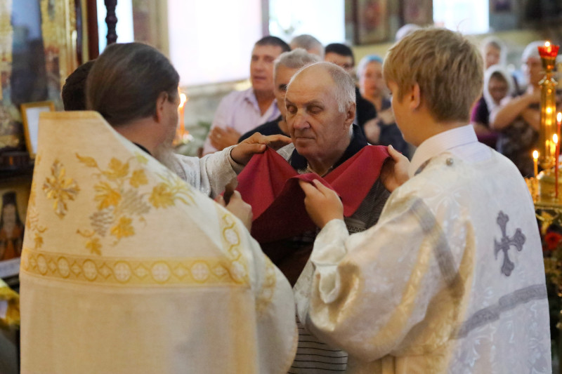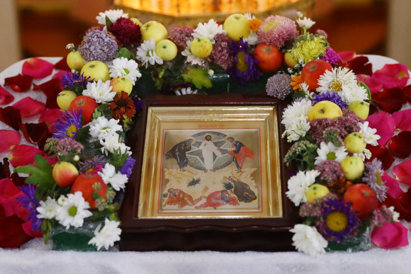 На Литургии было прочитано Евангельское Зачало 70 от Матфея: По прошествии дней шести, взял Иисус Петра, Иакова и Иоанна, брата его, и возвел их на гору высокую одних, и преобразился пред ними: и просияло лице Его, как солнце, одежды же Его сделались белыми, как свет. И вот, явились им Моисей и Илия, с Ним беседующие. При сем Петр сказал Иисусу: Господи! хорошо нам здесь быть; если хочешь, сделаем здесь три кущи: Тебе одну, и Моисею одну, и одну Илии. Когда он еще говорил, се, облако светлое осенило их; и се, глас из облака глаголющий: Сей есть Сын Мой Возлюбленный, в Котором Мое благоволение; Его слушайте. И, услышав, ученики пали на лица свои и очень испугались. Но Иисус, приступив, коснулся их и сказал: встаньте и не бойтесь. Возведя же очи свои, они никого не увидели, кроме одного Иисуса. И когда сходили они с горы, Иисус запретил им, говоря: никому не сказывайте о сем видении, доколе Сын Человеческий не воскреснет из мертвых.(Мф. 17:1-9)