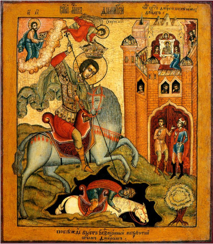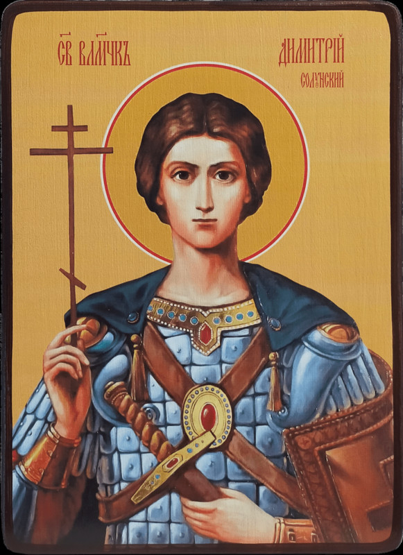 | Велика обрете в бедах тя поборни ка вселенная, страстотерпче, языки по беждающа. Якоже убо Лиеву низложил еси гордыню, и на подвиг дерзновенна сотворив Нестора, тако, святе Димитрие, Христу Богу молися даровати нам велию милость. Тропарь Димитрию Солунскому. |