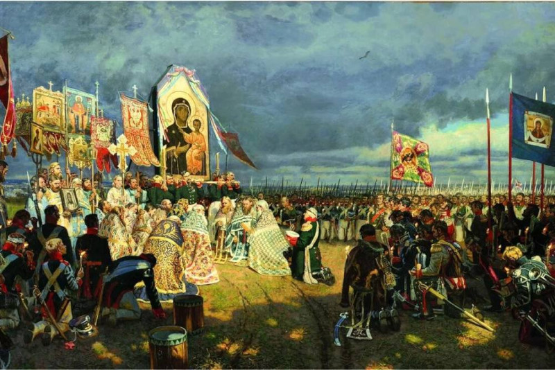Новый список воспринял благодатную силу древнего образа, и, когда русские войска 5 августа 1812 года оставляли Смоленск, икону взяли с собой для охранения от неприятеля. Накануне Бородинской битвы этот образ носили по лагерю, чтобы укрепить и ободрить воинов к великому подвигу. Древний образ Смоленской Одигитрии, взятый временно в Успенский собор, в день Бородинской битвы вместе с Иверской и Владимирской иконами Божией Матери обносили вокруг Белого города, Китай-города и кремлевских стен, а затем отправили к больным и раненым в Лефортовский дворец. Перед оставлением Москвы икона была взята в Ярославль.