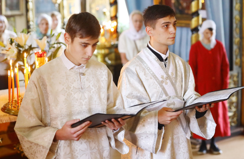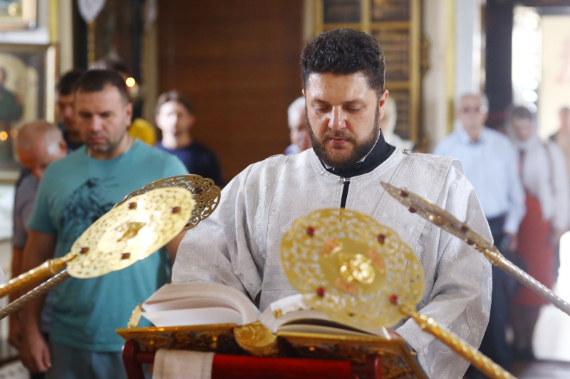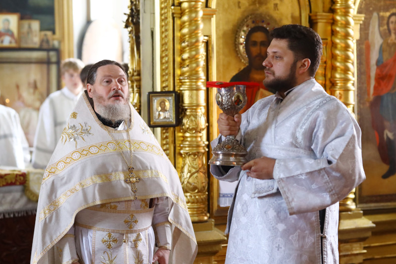 Литургия прошла по уставу службы первого дня праздника Преображения Господня. Были пропеты антифоны праздника Преображения. Третий антифон прочитали выпускник магистратуры Троице-Сергиевой Лавры Павел Березин и его воспитанник иподиакон Назарий Командриков.