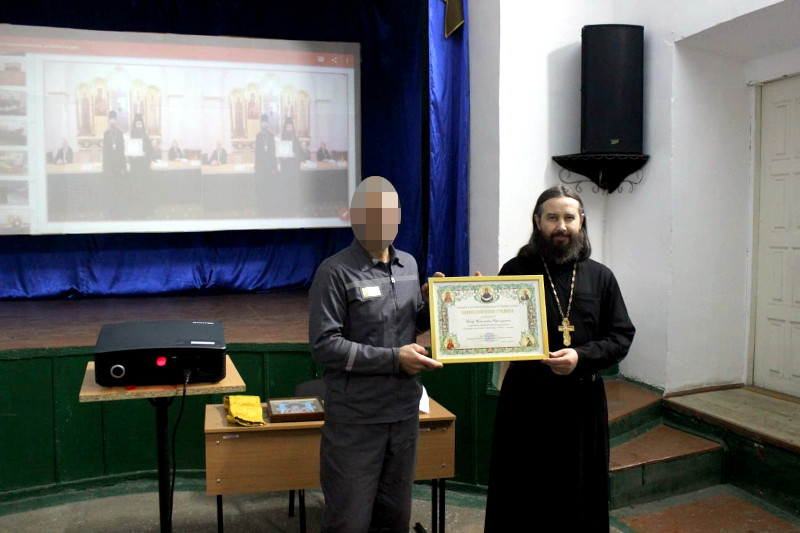 Во исполнение приказа: Синодального отдела Московского Патриархата по тюремному служению, священнослужитель по приезду в мужскую колонию № 48 наградил Черемушкина П.Н. Благословенной Грамотой Синодального отдела Русской Православной Церкви по тюремному служению за усердные труды во славу Святой Церкви и ценными подарками от Петропавловской и Булаевской епархии.