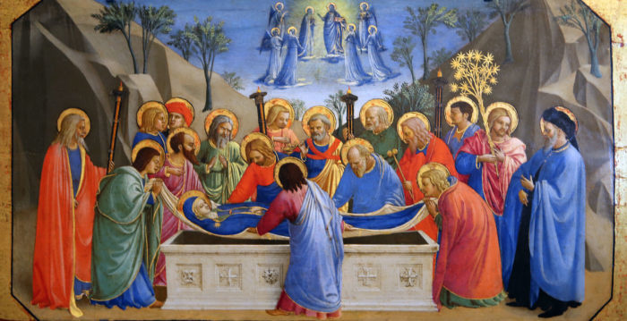 О приближении конца Ее земного пути Богородице сообщил Архангел Гавриил. И в назначенный срок апостолы, прибывшие в Иерусалим из мест, где они проповедовали, собрались возле Ее постели, чтобы попрощаться с Ней и затем совершить погребение. Когда же на третий день после похорон они открыли гробницу, которая по обычаям того времени была устроена в пещере, Божией Матери там не оказалось. Вскоре Богородица в окружении ангелов явилась апостолам, и стало понятно, что Она и душой, и телом вознеслась на небо.