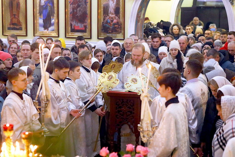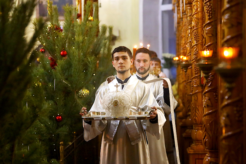Накануне Праздника клирики кафедрального собора совершили Всенощное бдение с освящением хлебов, пшеницы, вина и елея. Верующие были помазаны освященным маслом — символом Божьего благословения Его верным чадам. Было пропето величание празднику Рождества Христова: Велича́ем Тя, Живода́вче Христе́, нас ра́ди ны́не пло́тию Ро́ждшагося от Безневе́стныя и Пречи́стыя Де́вы Мари́и. и прочитан канон праздника.