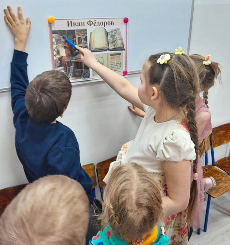 Учитель рассказал ребятам о том, что нашёлся человек, который посвятил себя этому важному делу — первопечатник Иван Фёдоров. Дети слушали стихи о первом русском печатнике и о его знаменитой книге — «Апостол». Ребята также узнали, что первую детскую «Азбуку» тоже напечатал Иван Фёдоров.