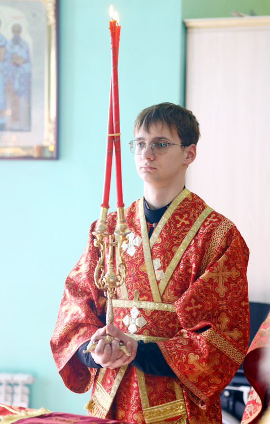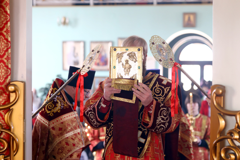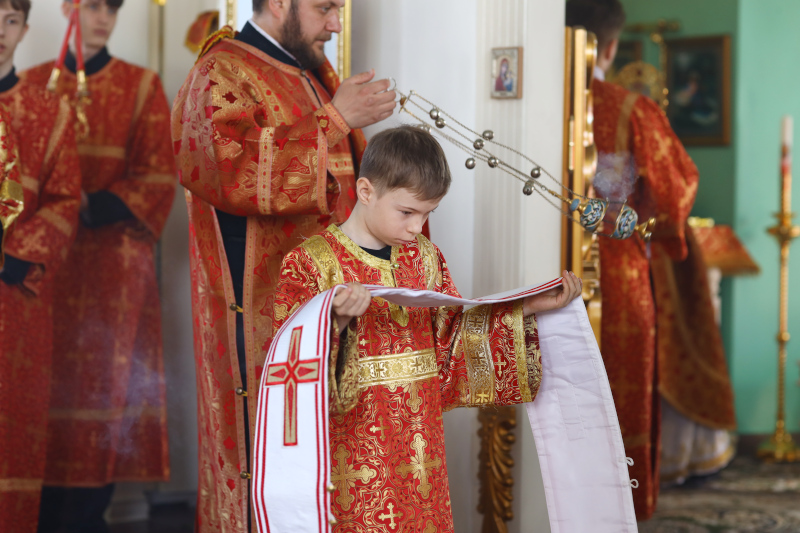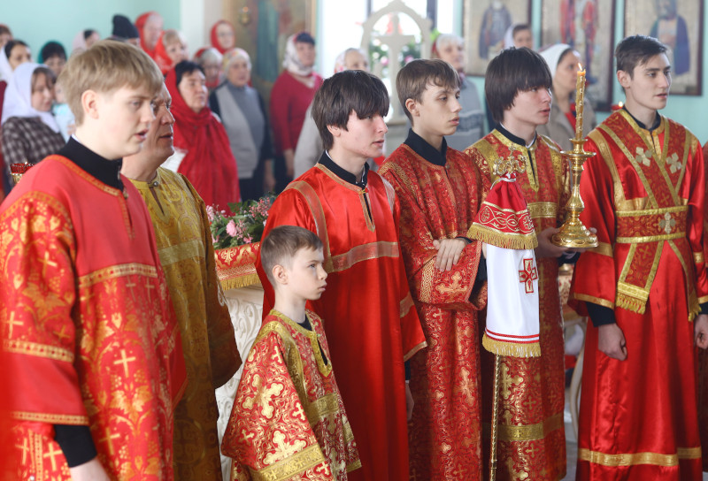 На Литургии было зачитано Евангельское Зачало 65 от Иоанна: «В тот же первый день недели вечером, когда двери дома, где собирались ученики Его, были заперты из опасения от Иудеев, пришёл Иисус, и стал посреди, и говорит им: мир вам! Сказав это, Он показал им руки и ноги и ребра Свои. Ученики обрадовались, увидев Господа. Иисус же сказал им вторично: мир вам! как послал Меня Отец, так и Я посылаю вас. Сказав это, дунул, и говорит им: примите Духа Святого. Кому простите грехи, тому простятся; на ком оставите, на том останутся. Фома же, один из двенадцати, называемый Близнец, не был тут с ними, когда приходил Иисус. Другие ученики сказали ему: мы видели Господа. Но он сказал им: если не увижу на руках Его ран от гвоздей, и не вложу перста моего в раны от гвоздей, и не вложу руки моей в ребра Его, не поверю. После восьми дней опять были в доме ученики Его, и Фома с ними. Пришёл Иисус, когда двери были заперты, стал посреди них и сказал: мир вам! Потом говорит Фоме: подай перст твой сюда и посмотри руки Мои; подай руку твою и вложи в ребра Мои; и не будь неверующим, но верующим. Фома сказал Ему в ответ: Господь мой и Бог мой! Иисус говорит ему: ты поверил, потому что увидел Меня; блаженны не видевшие и уверовавшие. Много сотворил Иисус пред учениками Своими и других чудес, о которых не писано в книге сей. Сие же написано, дабы вы уверовали, что Иисус есть Христос, Сын Божий, и, веруя, имели жизнь во имя Его». (Ин. 20:19-31)