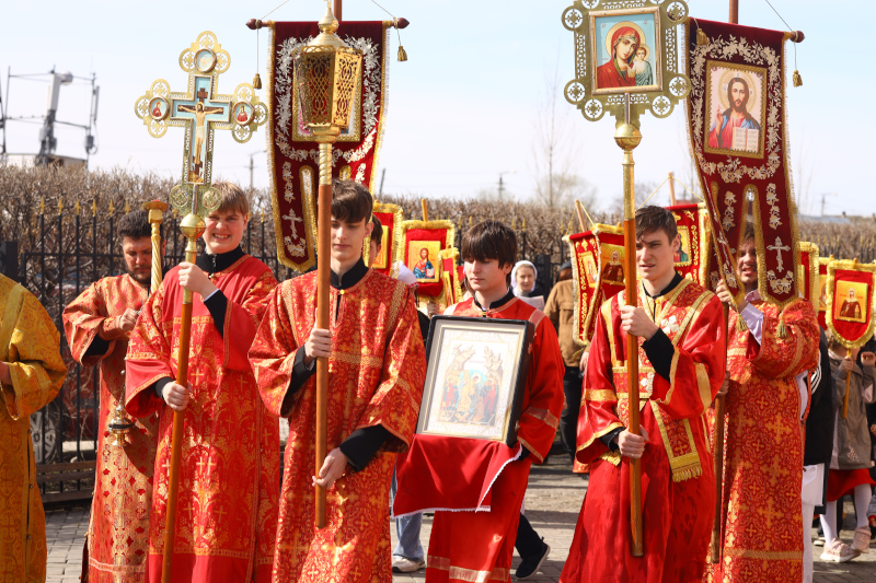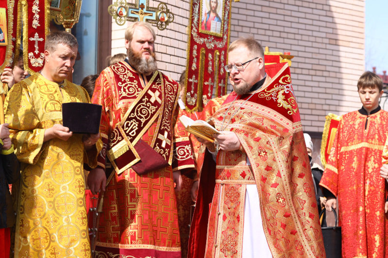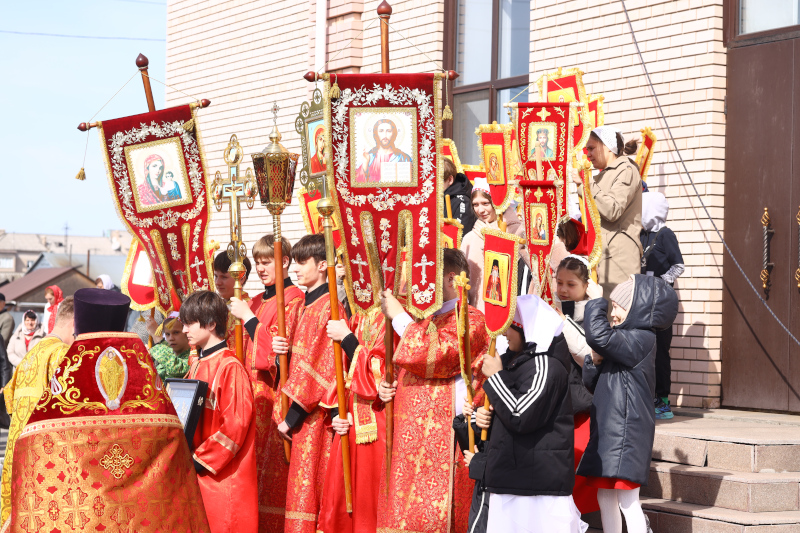 По окончании Литургии состоялся Пасхальный Крестный ход вокруг храма. Владыка обратился у собравшимся со словами проповеди. Настоятель храма устроил угощение для прихожан во дворе храма.