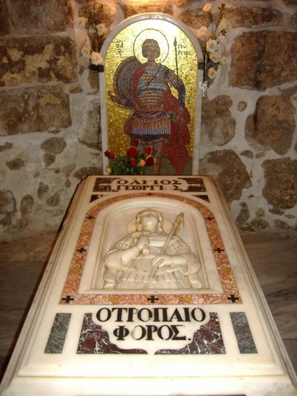 Мощи святого великомученика Георгия христиане перенесли на родину, в Лидду, и здесь он был погребен. Гробница, в которой были положены мощи великомученика, сейчас расположена в крипте православного храма, посвященного великомученику Георгию. В самом храме имеется частица мощей святого Георгия, а также цепь, которой был скован великомученик.