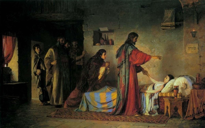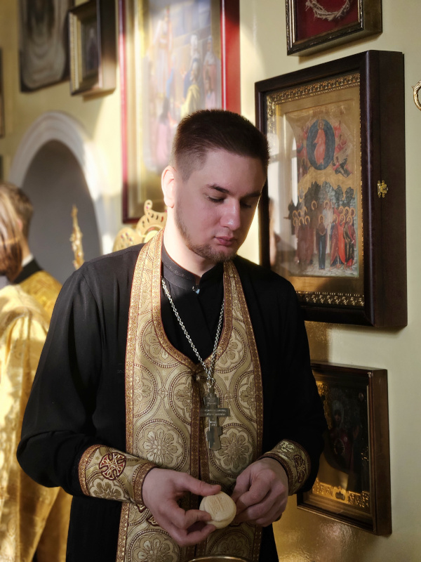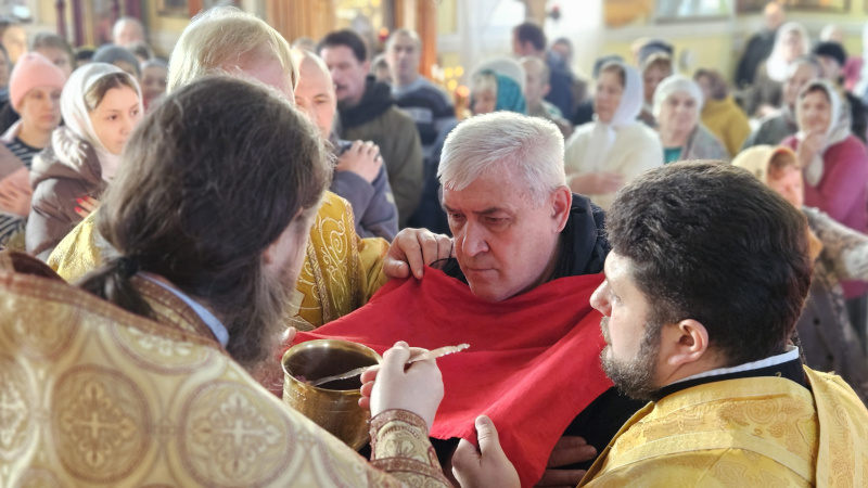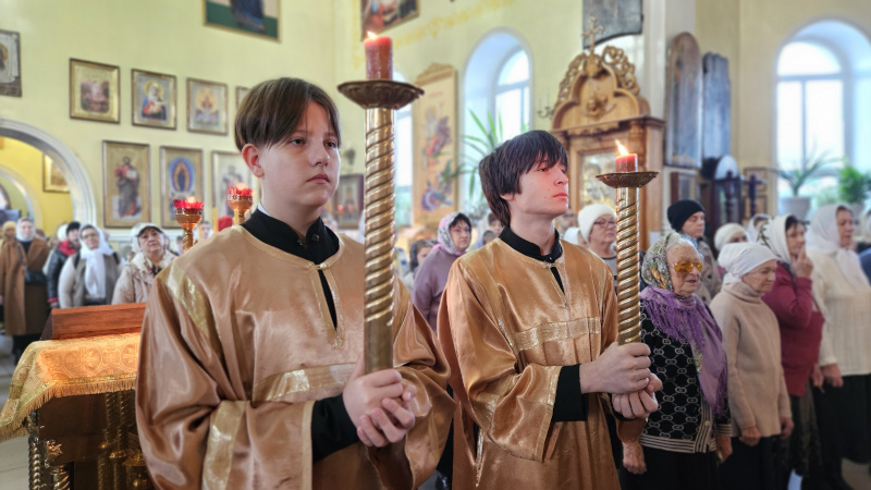 На Литургии было прочитано Воскресное Евангельское Зачало от Луки 39: И вот, пришел человек, именем Иаир, который был начальником синагоги; и, пав к ногам Иисуса, просил Его войти к нему в дом, потому что у него была одна дочь, лет двенадцати, и та была при смерти. Когда же Он шел, народ теснил Его. И женщина, страдавшая кровотечением двенадцать лет, которая, издержав на врачей все имение, ни одним не могла быть вылечена, подойдя сзади, коснулась края одежды Его; и тотчас течение крови у ней остановилось. И сказал Иисус: кто прикоснулся ко Мне? Когда же все отрицались, Петр сказал и бывшие с Ним: Наставник! народ окружает Тебя и теснит, — и Ты говоришь: кто прикоснулся ко Мне? Но Иисус сказал: прикоснулся ко Мне некто, ибо Я чувствовал силу, исшедшую из Меня. Женщина, видя, что она не утаилась, с трепетом подошла и, пав пред Ним, объявила Ему перед всем народом, по какой причине прикоснулась к Нему и как тотчас исцелилась. Он сказал ей: дерзай, дщерь! вера твоя спасла тебя; иди с миром. Когда Он еще говорил это, приходит некто из дома начальника синагоги и говорит ему: дочь твоя умерла; не утруждай Учителя. Но Иисус, услышав это, сказал ему: не бойся, только веруй, и спасена будет. Придя же в дом, не позволил войти никому, кроме Петра, Иоанна и Иакова, и отца девицы, и матери. Все плакали и рыдали о ней. Но Он сказал: не плачьте; она не умерла, но спит. И смеялись над Ним, зная, что она умерла. Он же, выслав всех вон и взяв ее за руку, возгласил: девица! встань. И возвратился дух ее; она тотчас встала, и Он велел дать ей есть. И удивились родители ее. Он же повелел им не сказывать никому о происшедшем. (Лк. 8:41-56).