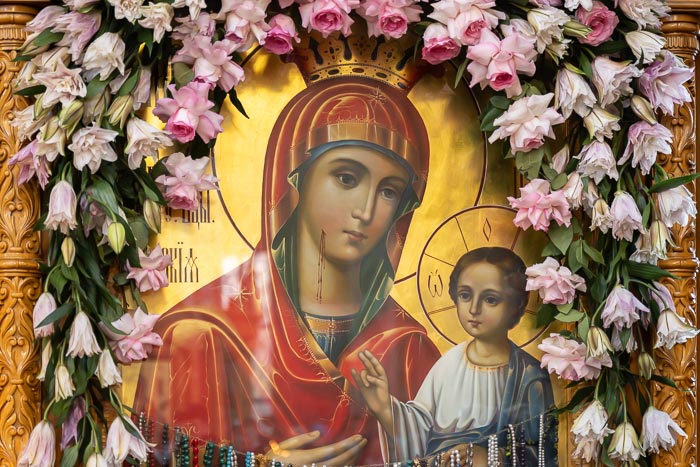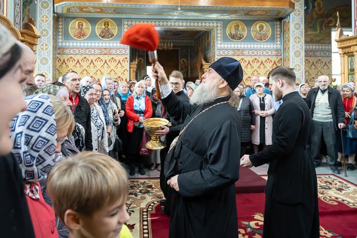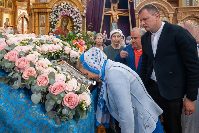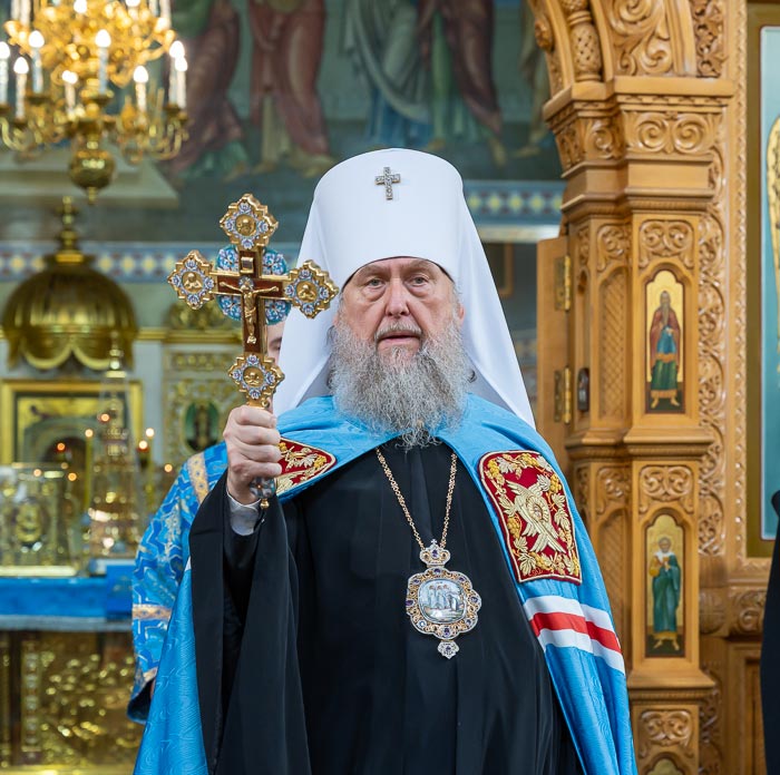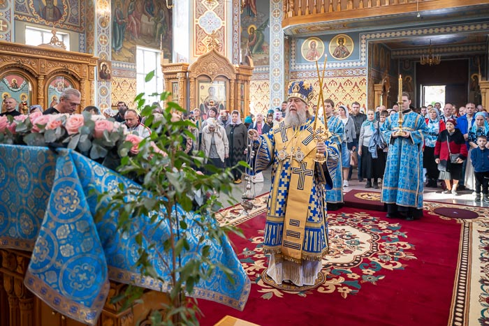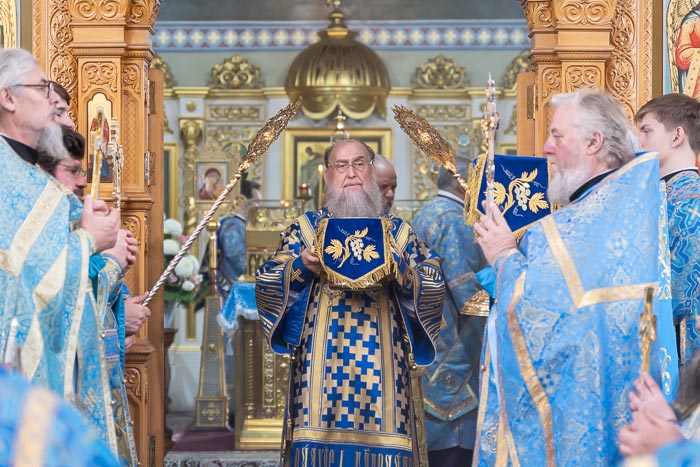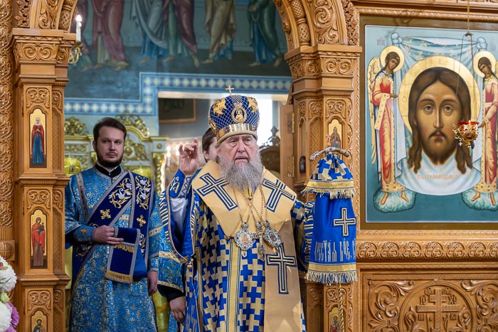 Литургия завершилась славлением Пресвятой Богородице перед ковчегом с Ее честным Поясом и Иверским образом Царицы Небесной, а также литией у гробницы митрополита Иосифа (Чернова), после чего митрополит Александр поздравил епископов, матушек игумений, духовенство и прихожан с престольным праздником и обратился к верующим со словами архипастырской проповеди.