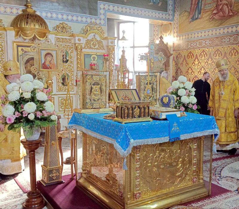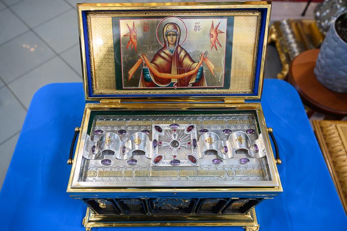 К началу богослужения в Софийский собор для молитвенного поклонения и духовного укрепления верующих был доставлен ковчег с великой православной святыней — частью Пояса Пресвятой Богородицы, хранящийся в домовом Иверско-Серафимовском храме митрополичьей резиденции в Алма-Ате.