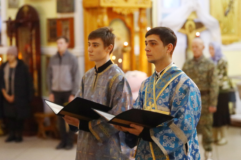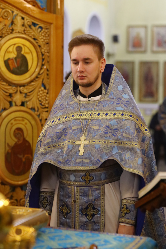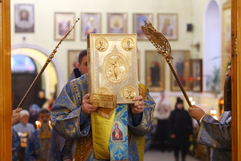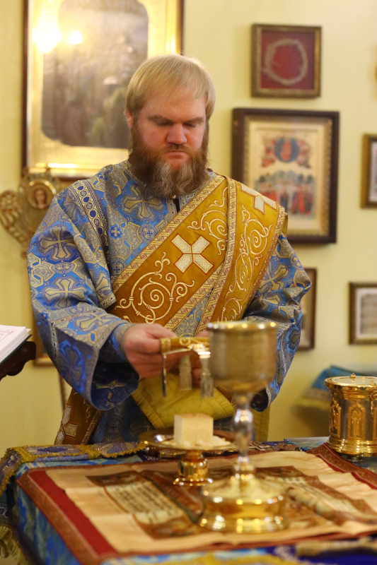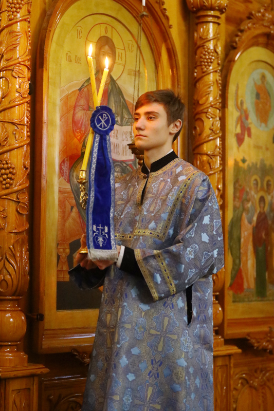 На Литургии было прочитано Евангельское Зачало 43 от Матфея: Рече́ Госпо́дь Свои́м ученико́м: вся Мне предана́ суть Oтце́м Мои́м, и никто́же зна́ет Сы́на, то́кмо Oте́ц: ни Oтца́ кто зна́ет, то́кмо Сын, и ему́же а́ще во́лит Сын откры́ти. Прииди́те ко Мне вси тружда́ющиися и обремене́ннии, и Аз упоко́ю вы. Возми́те и́го Мое́ на себе́, и научи́теся от Мене́, я́ко кро́ток есмь и смире́н се́рдцем, и обря́щете поко́й душа́м ва́шим. И́го бо Мое́ бла́го, и бре́мя Мое́ легко́ есть. (Мф 11:27–30)