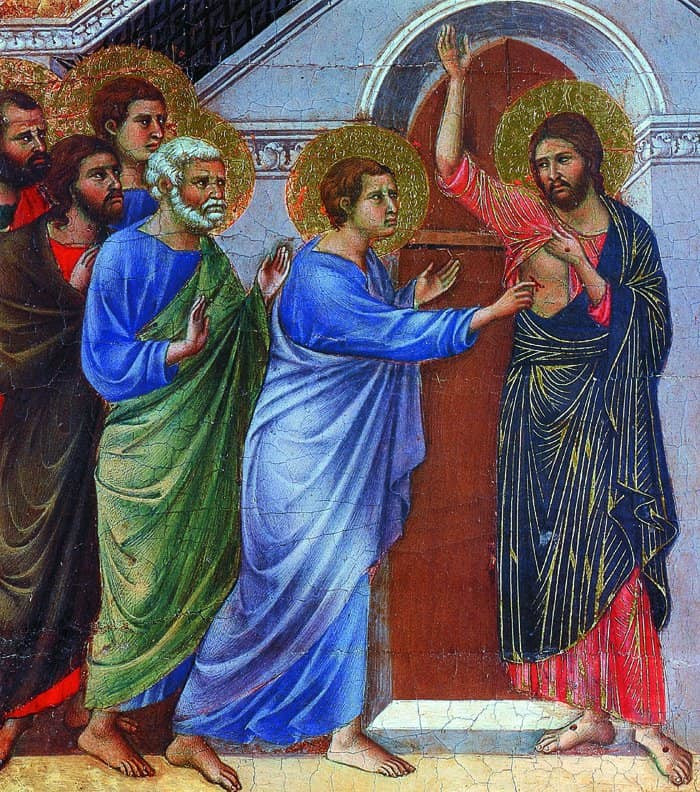 По свидетельству Священного Писания, святой апостол не поверил рассказам других учеников о Воскресении Иисуса Христа: «Аще не вижу на руку Его язвы гвоздинныя, и вложу перста моего в язвы гвоздинныя, и вложу руку мою в ребра Его, не иму веры» (Ин.20:25). На восьмой день после Воскресения Господь явился апостолу Фоме и показал Свои раны. «Господь мой и Бог мой!» — воскликнул святой апостол (Ин.20:28). «Фома, бывший некогда слабее других апостолов в вере, — говорит святитель Иоанн Златоуст, — сделался по благодати Божией мужественнее, ревностнее и неутомимее всех их, так что обошел со своей проповедью почти всю землю, не убоявшись возвещать Слово Божие народам диким».