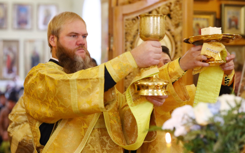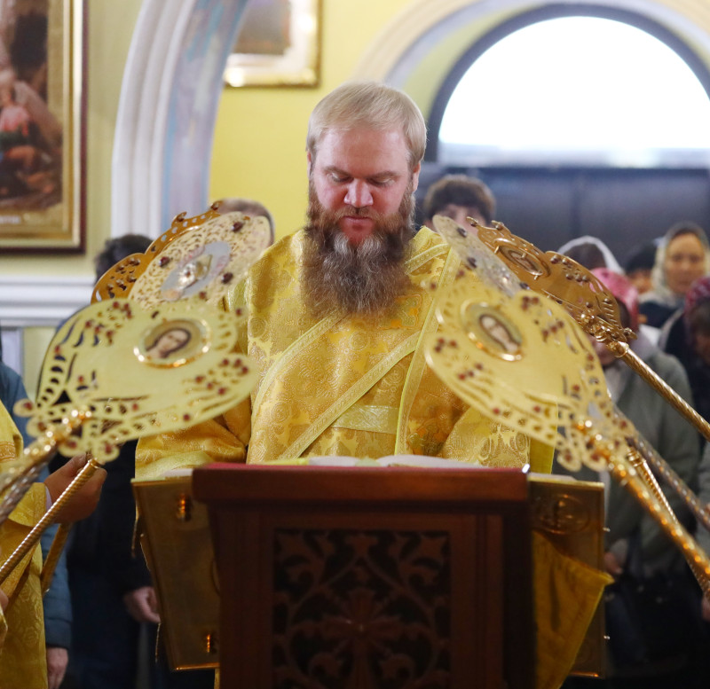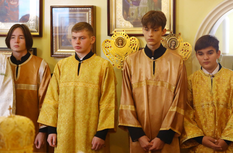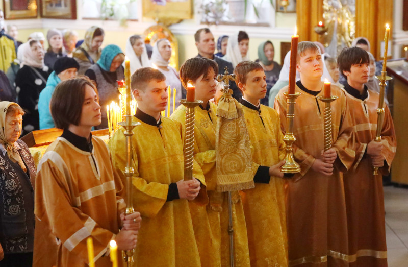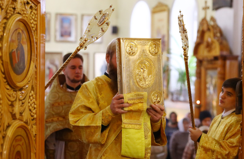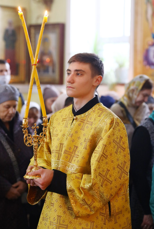 На Литургии было прочитано Евангельское Зачало 30 от Луки: После сего Иисус пошел в город, называемый Наин; и с Ним шли многие из учеников Его и множество народа. Когда же Он приблизился к городским воротам, тут выносили умершего, единственного сына у матери, а она была вдова; и много народа шло с нею из города. Увидев ее, Господь сжалился над нею и сказал ей: не плачь. И, подойдя, прикоснулся к одру; несшие остановились, и Он сказал: юноша! тебе говорю, встань! Мертвый, поднявшись, сел и стал говорить; и отдал его Иисус матери его. И всех объял страх, и славили Бога, говоря: великий пророк восстал между нами, и Бог посетил народ Свой. (Лк. 7:11-16)