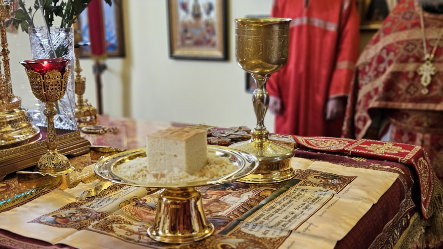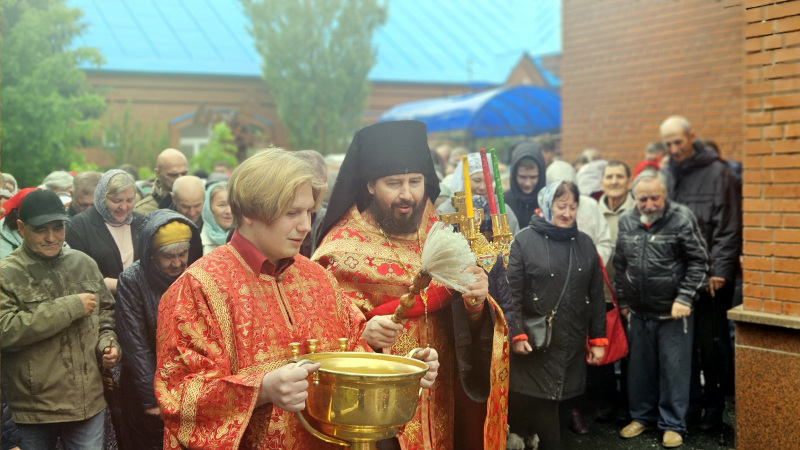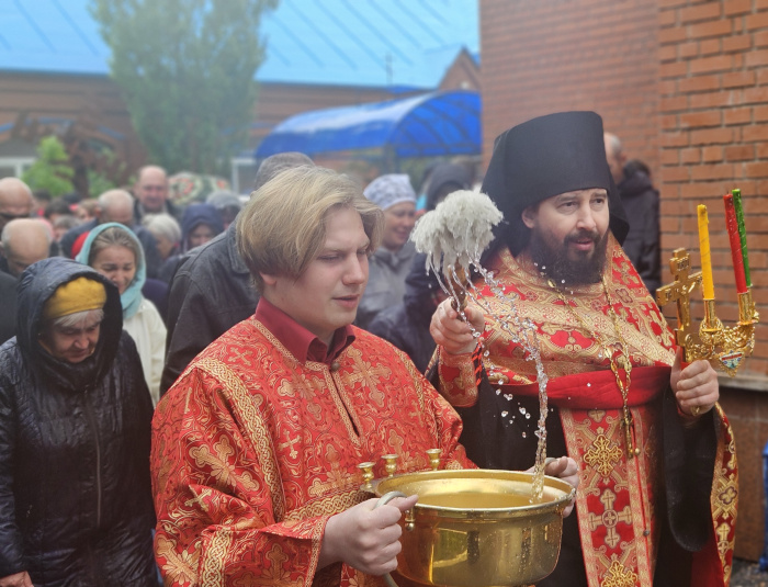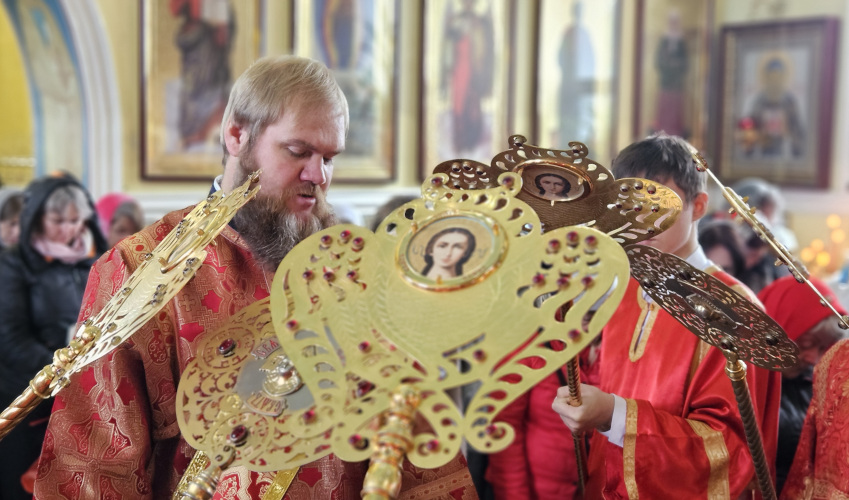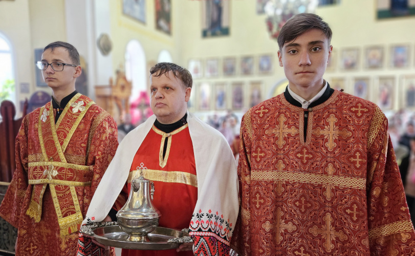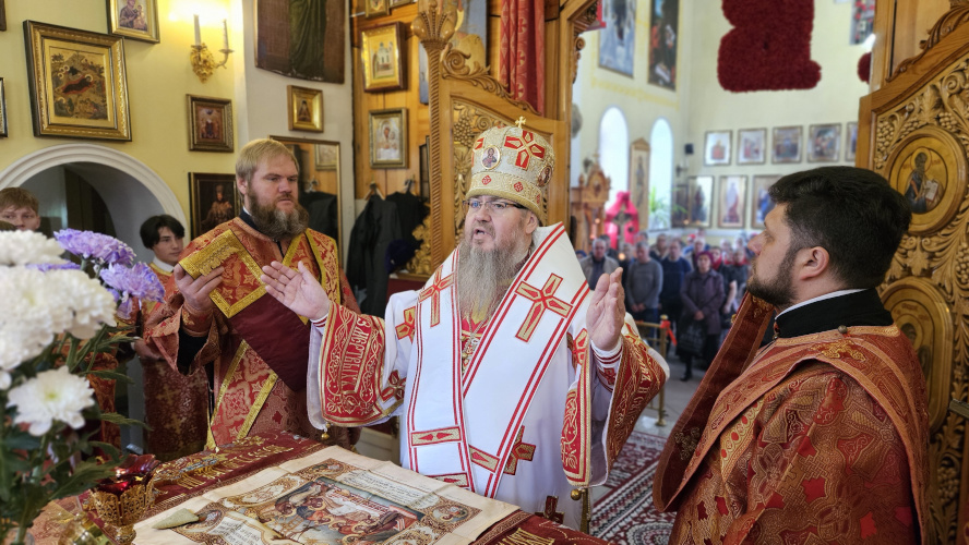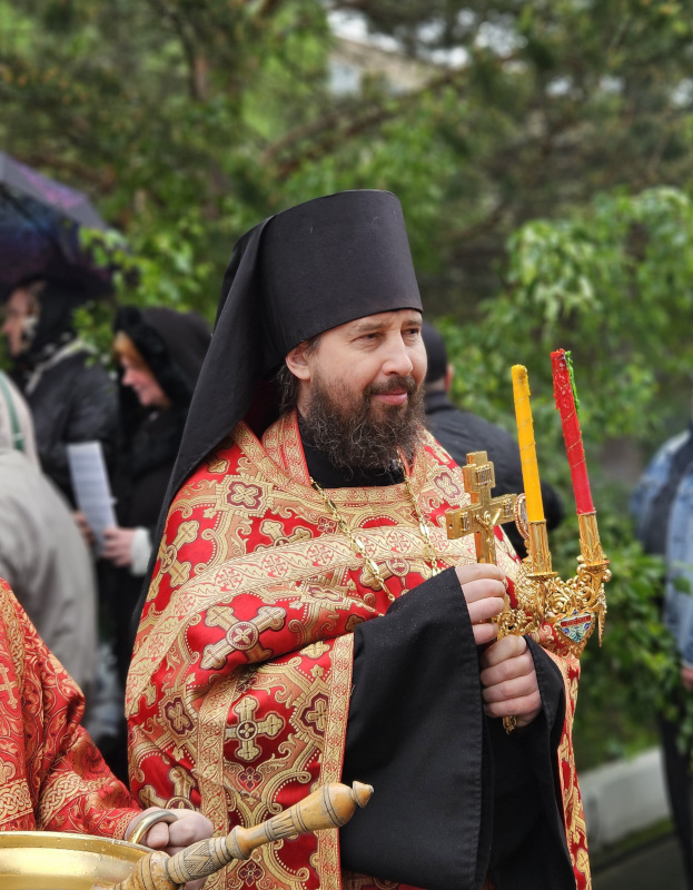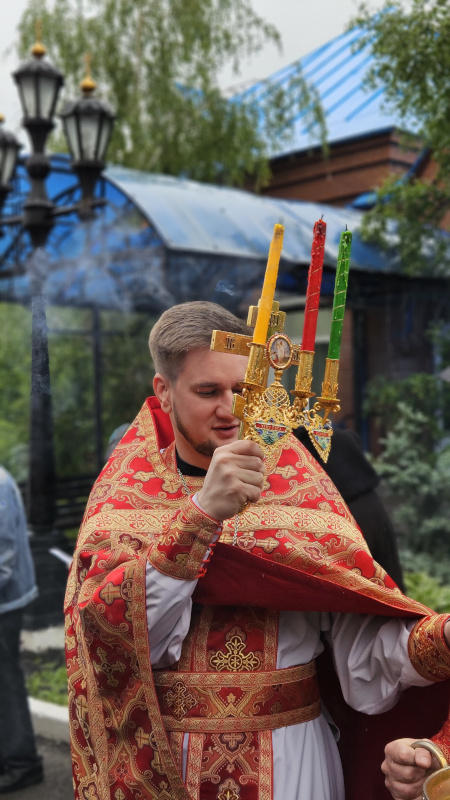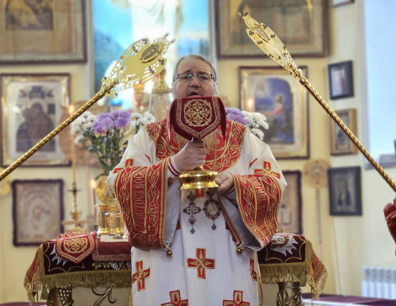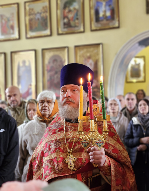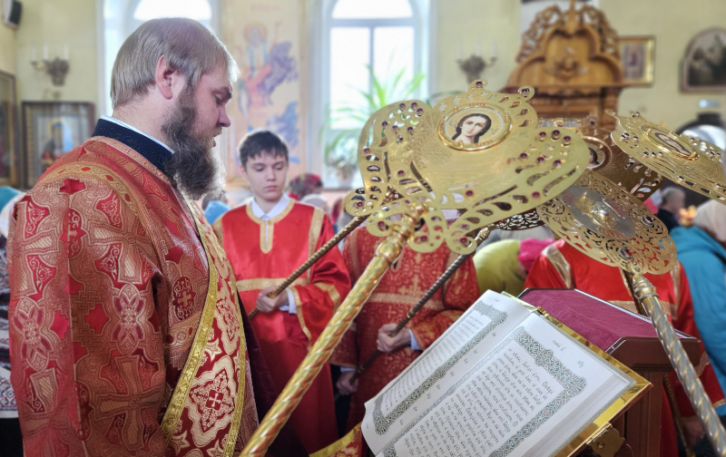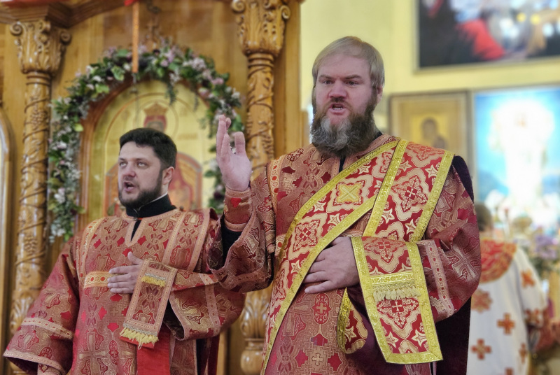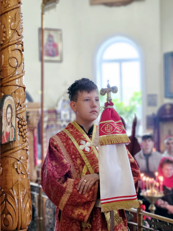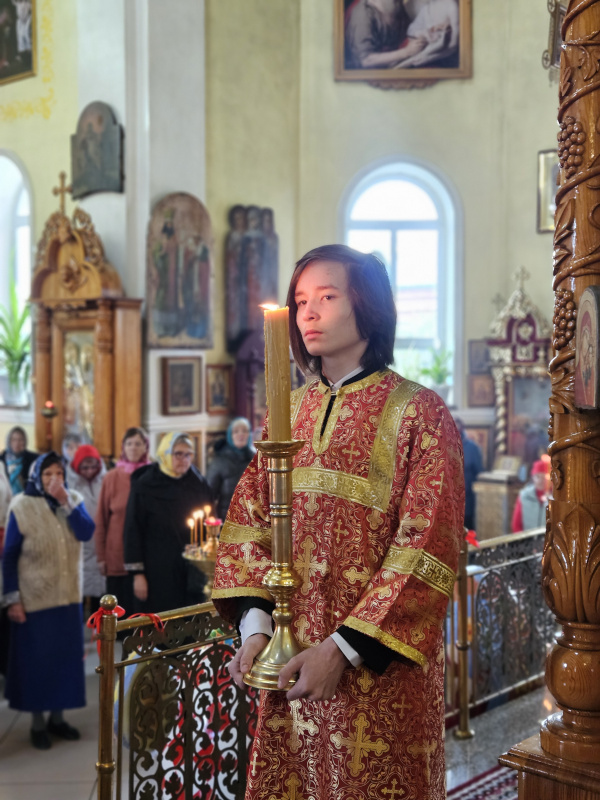 Литургия была совершена по уставу первой недели Пасхи Господней. Было прочитано воскресное Евангельское Зачало 34 от Иоанна об исцелении слепорожденного: И проходя, Он увидел человека слепого от рождения. И спросили Его ученики Его, говоря: Равви, кто согрешил: он или родители его, что слепым родился? Ответил Иисус: ни он не согрешил, ни родители его, но это для того, чтобы явлены были дела Божии на нем. Нам надо делать дела Пославшего Меня, доколе есть день: приходит ночь, когда никто не может делать. Пока Я в мире, Я свет миру. Сказав это, Он плюнул на землю, сделал смесь из слюны и помазал ему смесью глаза, и сказал ему: иди, умойся в водоёме Силоам (что значит в переводе: Посланный). Он пошел и умылся, и пришел зрячим. Тут соседи и видевшие его раньше, потому что был он нищий, стали говорить: не тот ли это, кто здесь сидит и просит милостыню? Одни говорили: это он; другие говорили: нет, но похож на него. Он говорил: это я. Сказали ему тогда: как же открылись твои глаза? Он ответил: Человек, называемый Иисус, сделал смесь и помазал мне глаза и сказал мне: иди в Силоам и умойся. Пошел я и, умывшись, прозрел. И сказали ему: где Он? Он говорит: не знаю. Ведут его к фарисеям, этого бывшего слепца. А была суббота в тот день, когда сделал смесь Иисус и открыл ему глаза. Снова начали спрашивать его фарисеи, как он прозрел. Он же сказал им: смесь положил Он мне на глаза, и умылся я, и вижу. Сказали тогда некоторые из фарисеев: не от Бога Этот Человек, потому что субботы не соблюдает. Другие же говорили: как может человек грешный творить такие знамения? И было между ними разделение. Тогда снова говорят слепому: что скажешь о Нем ты, Он ведь открыл тебе глаза? И тот сказал: Он пророк. Не поверили тогда Иудеи о нем, что он был слеп и прозрел, пока не призвали родителей самого прозревшего и не спросили их: ваш это сын, о котором вы говорите, что он родился слепым? Как же он теперь видит? И ответили родители его и сказали: мы знаем, что это наш сын, и что он родился слепым; а как он теперь видит, не знаем, или кто открыл ему глаза, мы не знаем; его спросите, он взрослый, сам о себе скажет. Это сказали родители его оттого, что боялись Иудеев; ибо Иудеи уже согласились между собой: если кто исповедает Его Христом, да будет отлучен от синагоги. Поэтому родители его сказали: он взрослый, его спросите. Итак, призвали человека вторично, того, кто был слеп, и сказали ему: воздай славу Богу; мы знаем, что Человек Тот грешник. Он же ответил: грешник ли Он, я не знаю; одно знаю, что слеп был и теперь вижу. Сказали ему: что Он сделал тебе? Как открыл тебе глаза? Он ответил им: я уже сказал вам, и вы не услышали. Почему снова хотите слушать? Не хотите ли и вы сделаться Его учениками? И обругали они его и сказали: ты ученик Того, а мы Моисеевы ученики. Мы знаем, что Моисею говорил Бог, а об Этом мы не знаем, откуда Он. Ответил человек и сказал им: это и удивительно, что вы не знаете, откуда Он, а Он открыл мне глаза. Мы знаем, что грешников Бог не слушает: но если кто боится Бога и волю Его творит, того слушает. От века не было слышно, чтобы кто открыл глаза слепорожденному, если бы не был Он от Бога, не мог бы творить ничего. Ответили они и сказали ему: в грехах ты весь родился, и ты учишь нас? И выгнали его вон. Услышал Иисус, что выгнали его вон, и, найдя его, сказал: веруешь ты в Сына Человеческого? Тот ответил и сказал: а кто Он, Господ