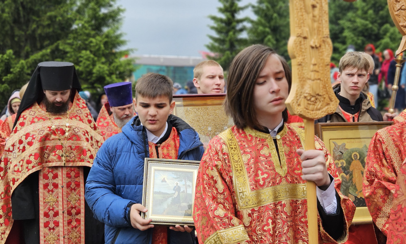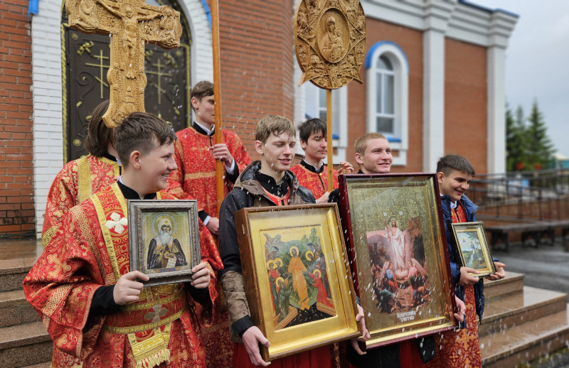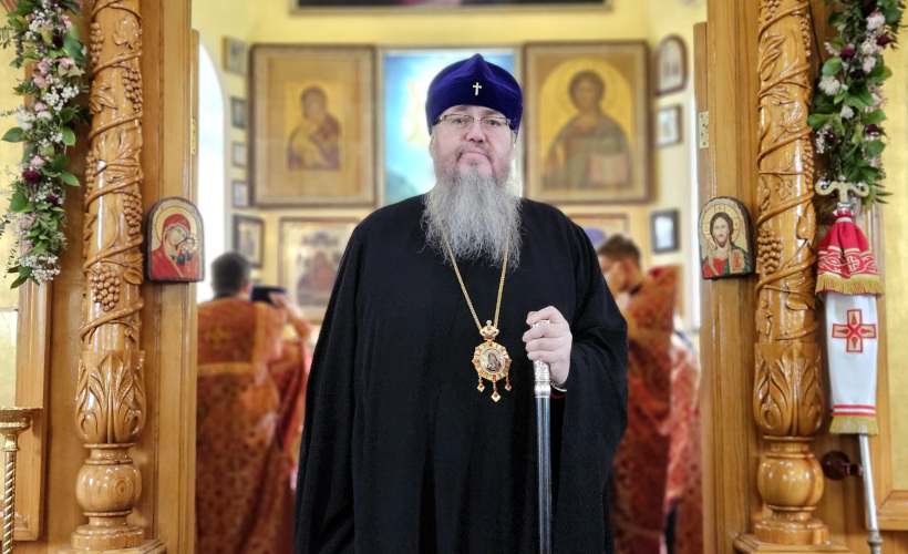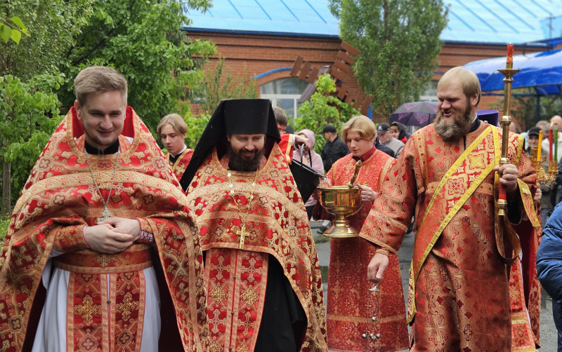 По окончании Божественной Литургии состоялся Пасхальный Крестный ход вокруг храма. Владыка обратился к прихожанам со словами проповеди.