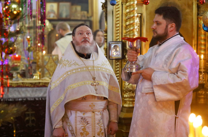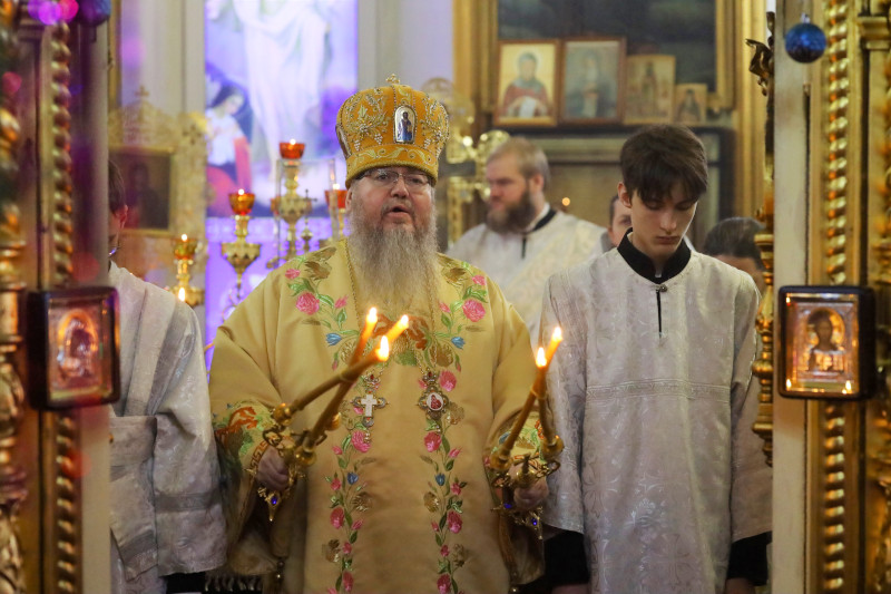Литургия была совершена по уставу первого дня праздника Рождества Христова. На Литургии было прочитано Евангельское Зачало 4 от Матфея: Когда же они отошли, — се, Ангел Господень является во сне Иосифу и говорит: встань, возьми Младенца и Матерь Его и беги в Египет, и будь там, доколе не скажу тебе, ибо Ирод хочет искать Младенца, чтобы погубить Его. Он встал, взял Младенца и Матерь Его ночью и пошел в Египет, и там был до смерти Ирода, да сбудется реченное Господом через пророка, который говорит: «из Египта воззвал Я Сына Моего.» Тогда Ирод, увидев себя осмеянным волхвами, весьма разгневался, и послал избить всех младенцев в Вифлееме и во всех пределах его, от двух лет и ниже, по времени, которое выведал от волхвов. Тогда сбылось реченное через пророка Иеремию, который говорит: «глас в Раме слышен, плач и рыдание и вопль великий; Рахиль плачет о детях своих и не хочет утешиться, ибо их нет». По смерти же Ирода, — се, Ангел Господень во сне является Иосифу в Египте и говорит: встань, возьми Младенца и Матерь Его и иди в землю Израилеву, ибо умерли искавшие души Младенца. Он встал, взял Младенца и Матерь Его и пришел в землю Израилеву. Услышав же, что Архелай царствует в Иудее вместо Ирода, отца своего, убоялся туда идти; но, получив во сне откровение, пошел в пределы Галилейские и, придя, поселился в городе, называемом Назарет, да сбудется реченное через пророков, что Он Назореем наречется. (Мф. 2:13-23)