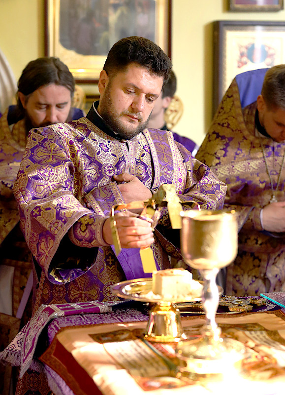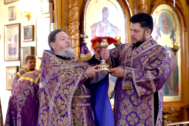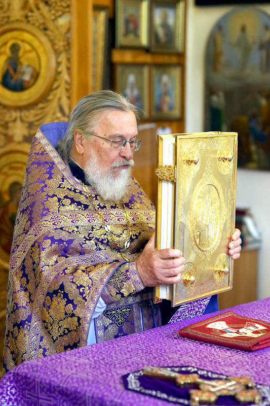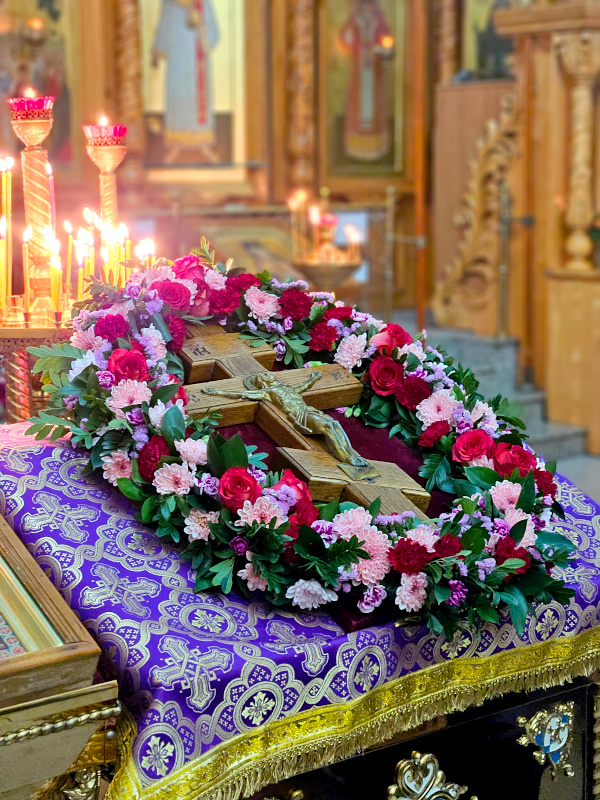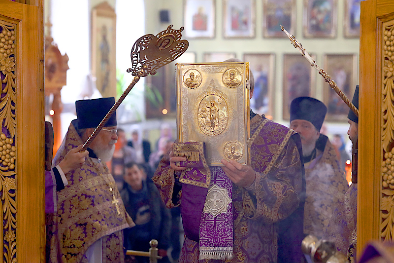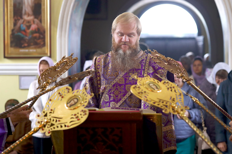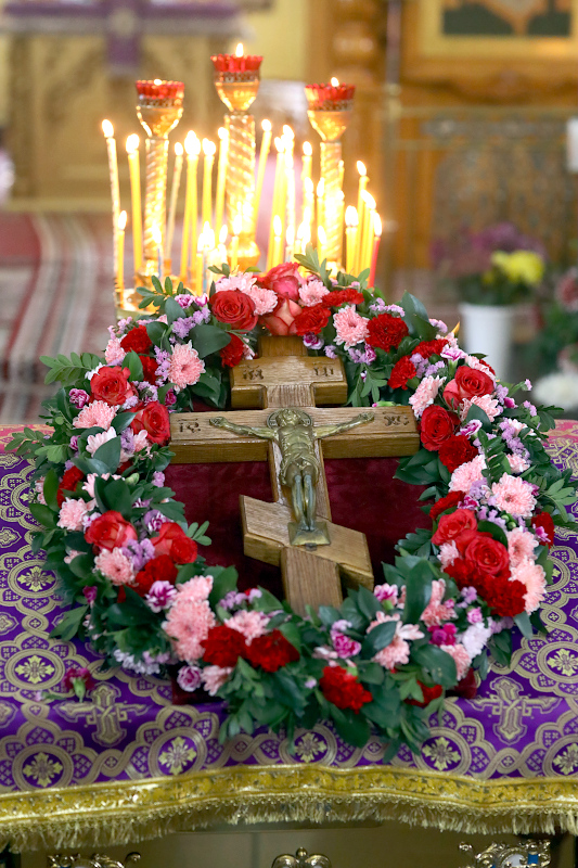 На Литургии были пропеты антифоны праздника Воздвижения, прочитаны Апостол и Евангелие праздника. Евангельское Зачало 60 от Иоанна: Когда же увидели Его первосвященники и служители, они закричали: распни, распни. Говорит им Пилат: возьмите Его вы и распните, ибо я не нахожу в Нем вины. Ответили ему Иудеи: у нас есть Закон, и по Закону Он должен умереть, потому что сделал Себя Сыном Божиим. Когда услышал Пилат это слово, он еще сильнее устрашился, и вошел в преторию снова и говорит Иисусу: откуда Ты? Иисус же ответа не дал ему. Говорит Ему тогда Пилат: мне ли не говоришь? Разве Ты не знаешь, что я власть имею отпустить Тебя, и власть имею распять Тебя? Ответил ему Иисус: ты не имел бы надо Мной никакой власти, если бы не было дано тебе свыше. Поэтому тот, кто Меня предал тебе, больший грех имеет. Пилат, услышав эти слова, вывел Иисуса наружу и сел для вершения суда на место, называемое «Каменным помостом», а по-еврейски Гаввафа. Была же пятница перед Пасхой, около шестого часа. И говорит он Иудеям: вот Царь ваш. Тогда закричали они: долой, долой, распни Его! Говорит им Пилат: Царя ли вашего распну? Ответили первосвященники: нет у нас царя, кроме кесаря. Тогда он предал Его им на распятие. Итак, взяли Иисуса и повели. И неся Себе крест, Он вышел на место, называемое Лобным, которое по-еврейски называется Голгофа, где Его распяли, и с Ним двух других, по обе Его стороны, посредине же — Иисуса. И сделал надпись на доске Пилат и поставил на кресте. Было же написано: Иисус Назорей, Царь Иудейский.