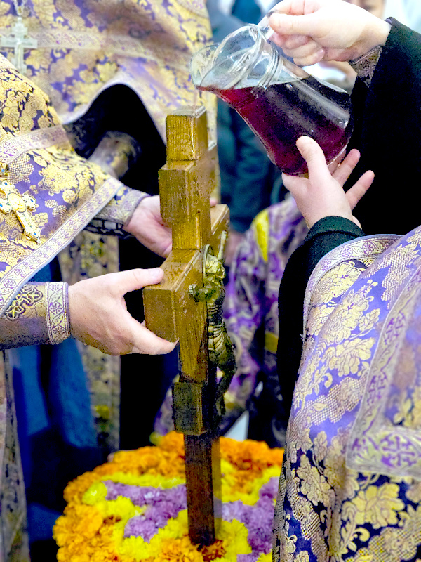 Богослужебной особенностью праздника Воздвижения Креста Господня, отличающей его в ряду других великих Господских праздников, является вынос на средину храма Креста для поклонения ему, каковой совершается по окончании великого славословия при пении «Святый Боже». В кафедральном соборе по выносе Креста, перед поклонением ему, совершился чин Воздвижения Креста.