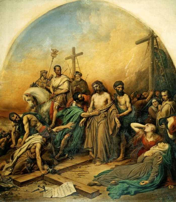 Эту надпись на доске многие прочли из Иудеев, потому что близко было от города то место, где был распят Иисус, и было написано по-еврейски, по-римски, по-гречески. Стояли же у креста Иисуса Мать Его и сестра Матери Его, Мария Клеопова и Мария Магдалина. Иисус же, увидев Мать и ученика, близ стоящего, которого Он любил, говорит Матери: Женщина, вот сын Твой. Потом говорит ученику: вот Мать твоя. И с того часа взял ученик Ее к себе. После этого Иисус, зная, что уже всё совершилось, говорит, дабы свершилось Писание: жажду. И когда вкусил Иисус уксуса, Он сказал: совершилось. И склонив голову, предал дух. А так как была пятница, то Иудеи, чтобы тела не остались на кресте в субботу — ибо день той субботы был день великий, — попросили Пилата перебить у них голени и снять их. Итак, пришли воины, и у первого перебили голени, и у другого, распятого с Ним. Придя же к Иисусу, они, когда увидели, что Он уже умер, не перебили у Него голеней, но один ив воинов копьем пронзил Ему бок, и вышла тотчас кровь и вода. И видевший засвидетельствовал, и истинно его свидетельство, и он знает, что истинное говорит, чтобы и вы верили. (Ин. 19: 6-11, 13-20, 25-28,30-35)