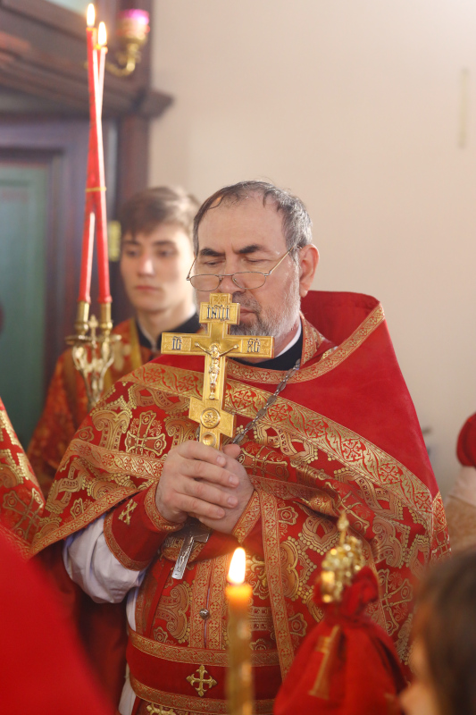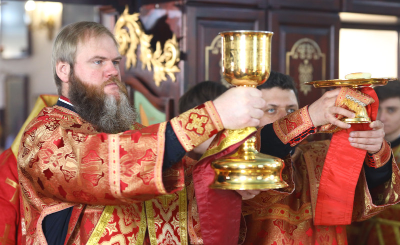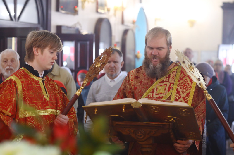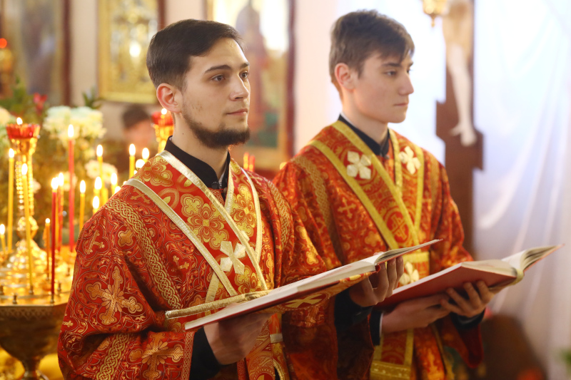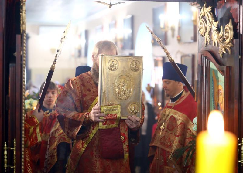 На Литургии было прочитано Евангельское Зачало 54 от Луки: Во время оно, вниде Иисус в весь некую, жена же некая именем Марфа прият Его в дом свой. И сестра ей бе нарицаемая Мария, яже и седши при ногу Иисусову, слышаше слово Его. Марфа же молвяше о мнозе службе, ставши же рече: Господи, не брежеши ли, яко сестра моя едину мя остави служити; рцы убо ей, да ми поможет. Отвещав же Иисус, рече ей: Марфо, Марфо, печешися и молвиши о мнозе. Едино же есть на потребу. Мария же благую часть избра, яже не отымется от нея. Бысть же егда глаголаше сия, воздвигши некая жена глас от народа, рече Ему: блажено чрево носившее Тя, и сосца, яже еси ссал. Он же рече: темже убо блажени слышащии слово Божие, и хранящии е. (Лк 10:38–42; 11:27–28)