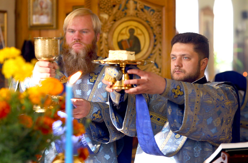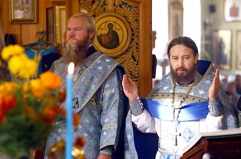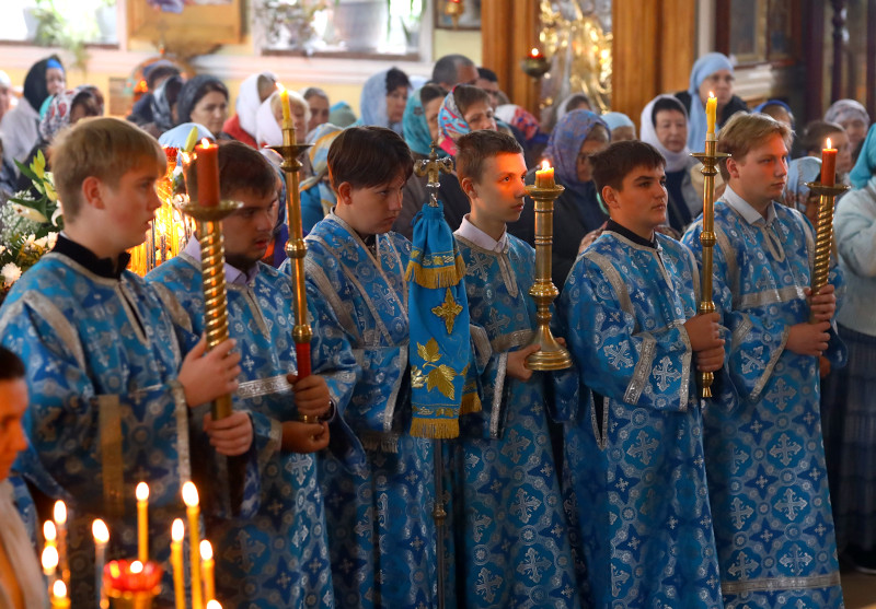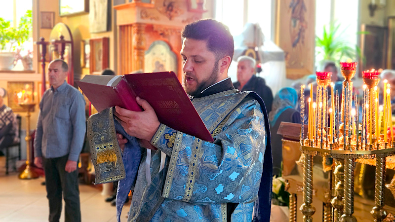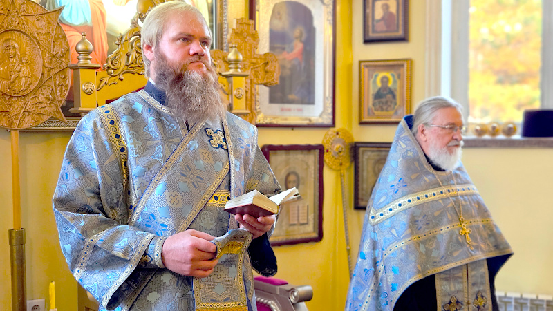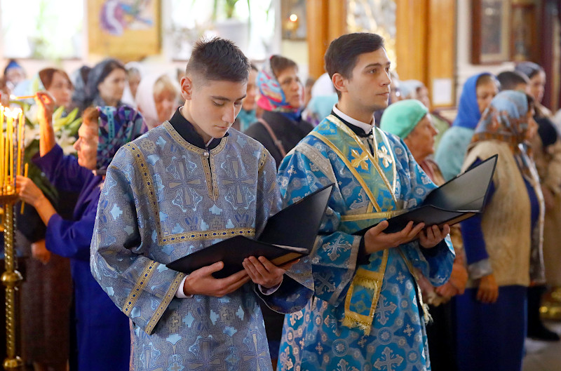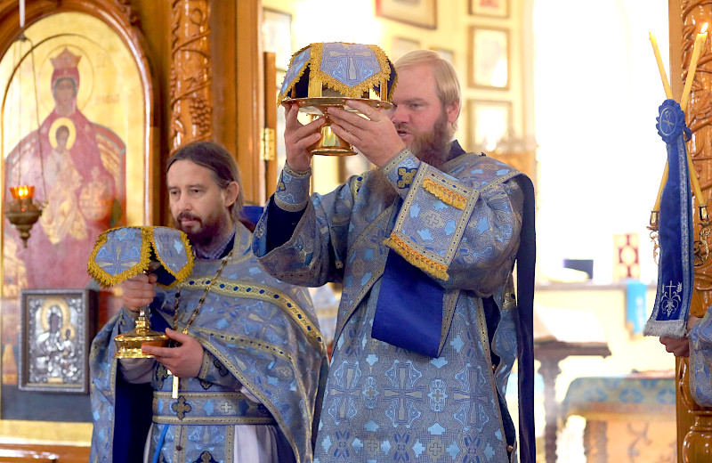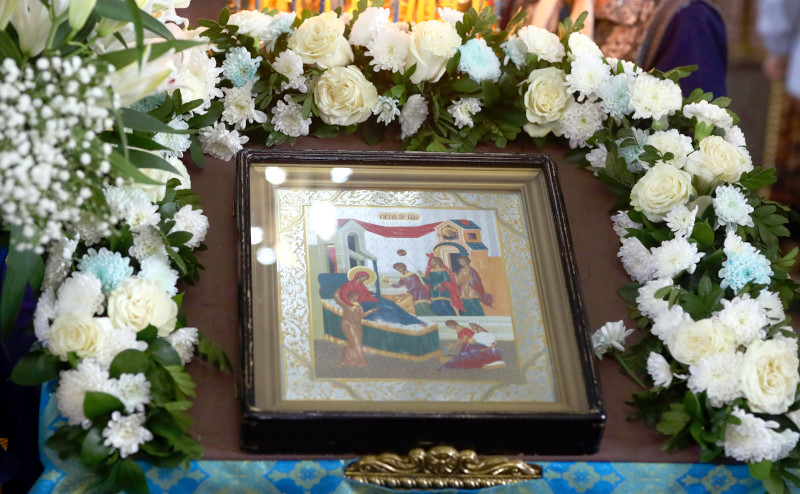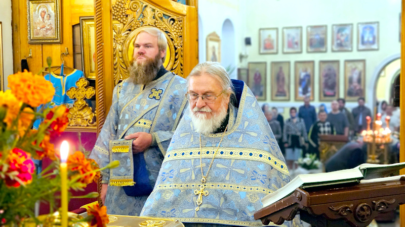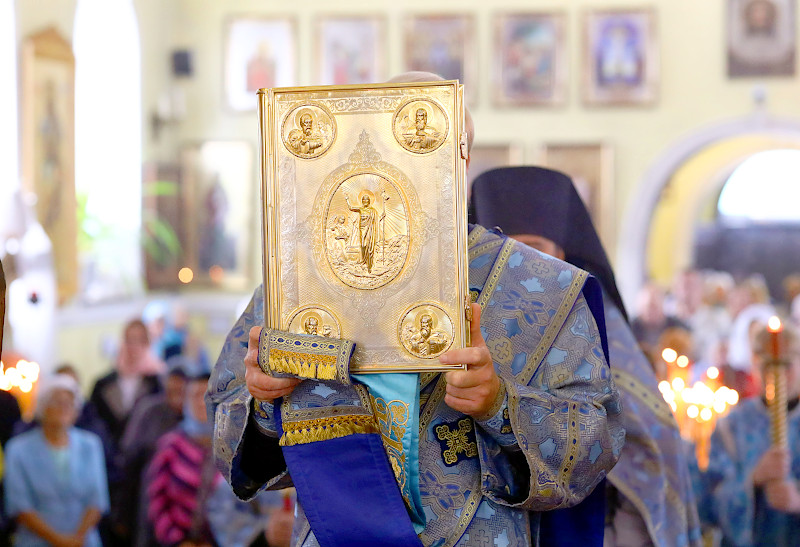 На Литургии было прочитано Богородичное Евангелие от Луки 54 Зачало: В продолжение пути их пришел Он в одно селение; здесь женщина, именем Марфа, приняла Его в дом свой; у нее была сестра, именем Мария, которая села у ног Иисуса и слушала слово Его. Марфа же заботилась о большом угощении и, подойдя, сказала: Господи! или Тебе нужды нет, что сестра моя одну меня оставила служить? скажи ей, чтобы помогла мне. Иисус же сказал ей в ответ: Марфа! Марфа! ты заботишься и суетишься о многом, а одно только нужно; Мария же избрала благую часть, которая не отнимется у нее. Когда же Он говорил это, одна женщина, возвысив голос из народа, сказала Ему: блаженно чрево, носившее Тебя, и сосцы, Тебя питавшие! А Он сказал: блаженны слышащие слово Божие и соблюдающие его. (Лк. 10, 38–42; 11, 27–28):