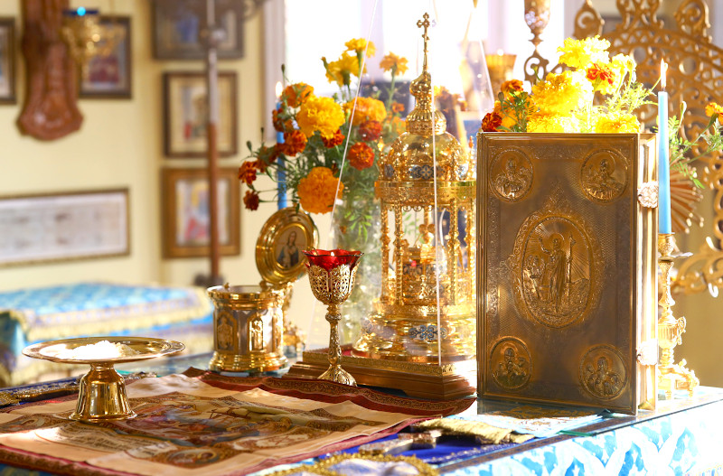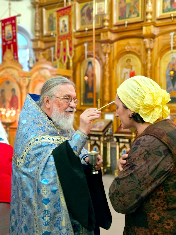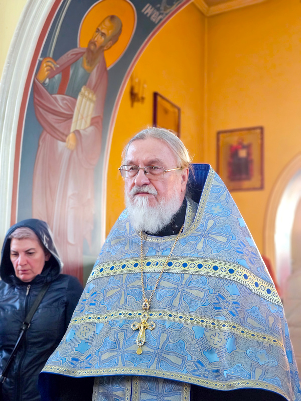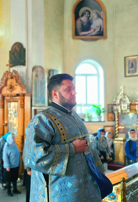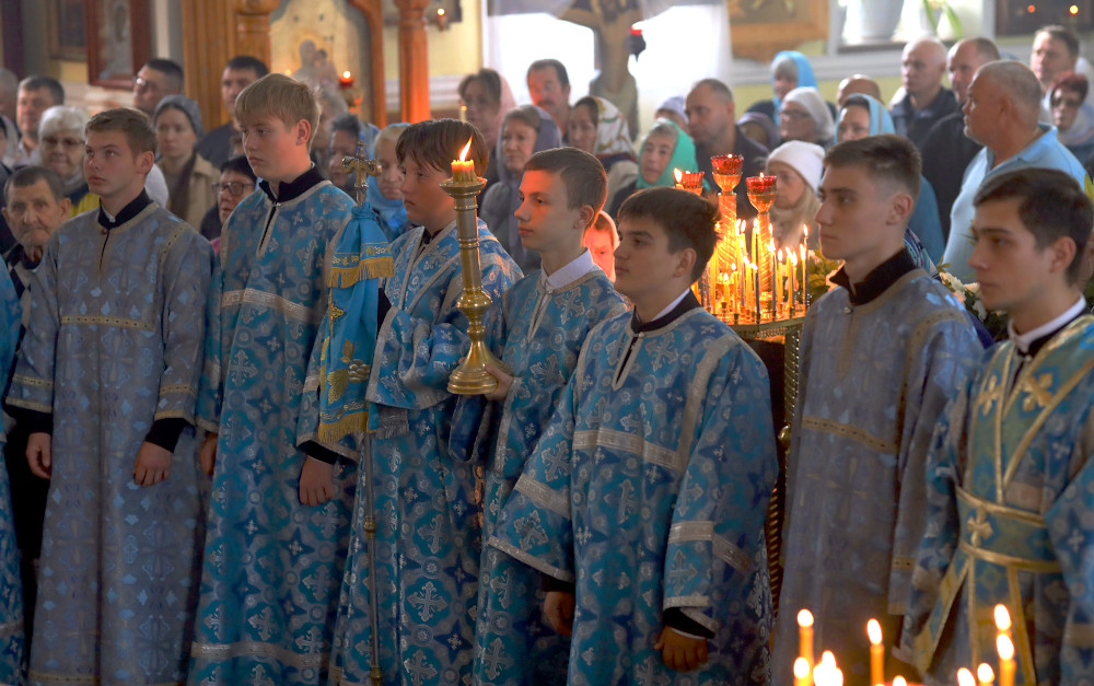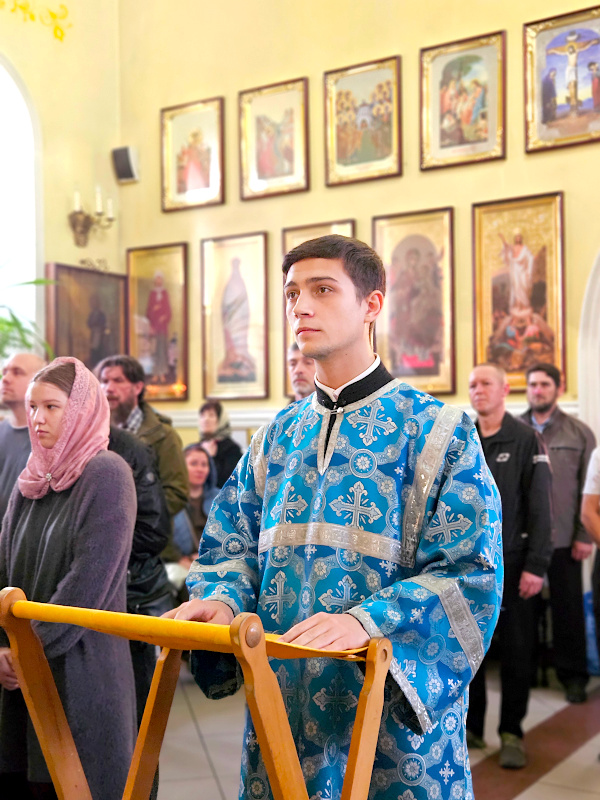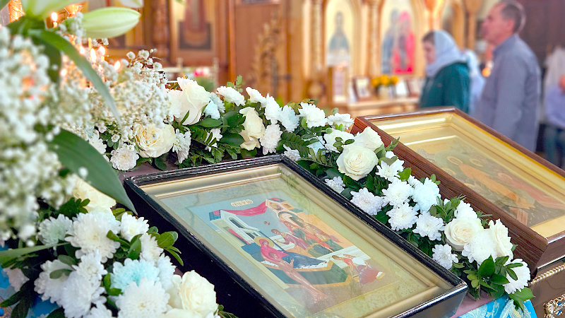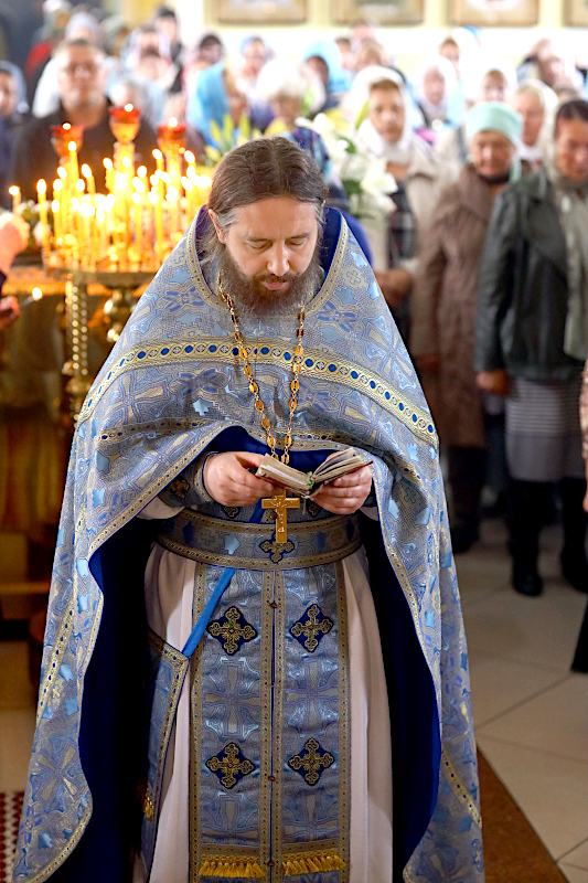 На Литургии было прочитано Богородичное Евангелие от Луки 54 Зачало: В продолжение пути их пришел Он в одно селение; здесь женщина, именем Марфа, приняла Его в дом свой; у нее была сестра, именем Мария, которая села у ног Иисуса и слушала слово Его. Марфа же заботилась о большом угощении и, подойдя, сказала: Господи! или Тебе нужды нет, что сестра моя одну меня оставила служить? скажи ей, чтобы помогла мне. Иисус же сказал ей в ответ: Марфа! Марфа! ты заботишься и суетишься о многом, а одно только нужно; Мария же избрала благую часть, которая не отнимется у нее. Когда же Он говорил это, одна женщина, возвысив голос из народа, сказала Ему: блаженно чрево, носившее Тебя, и сосцы, Тебя питавшие! А Он сказал: блаженны слышащие слово Божие и соблюдающие его. (Лк. 10, 38–42; 11, 27–28):