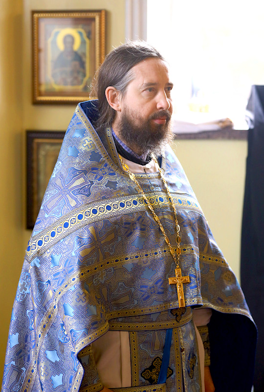 По окончании Литургии духовенство в центре храма совершило славление празднику, иером. Серафим (Максимов) обратился к собравшимся со словами проповеди.