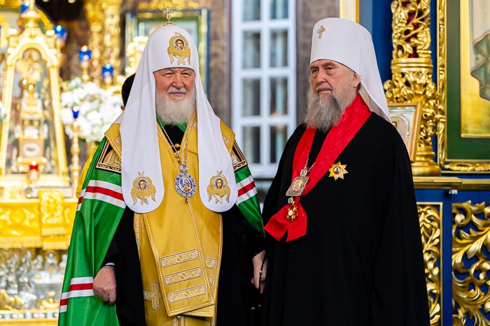 По окончании богослужения митрополит Астанайский и Казахстанский Александр обратился к Предстоятелю Русской Церкви со словами приветствия и преподнес Его Святейшеству старинную икону с изображением Успения Пресвятой Богородицы.