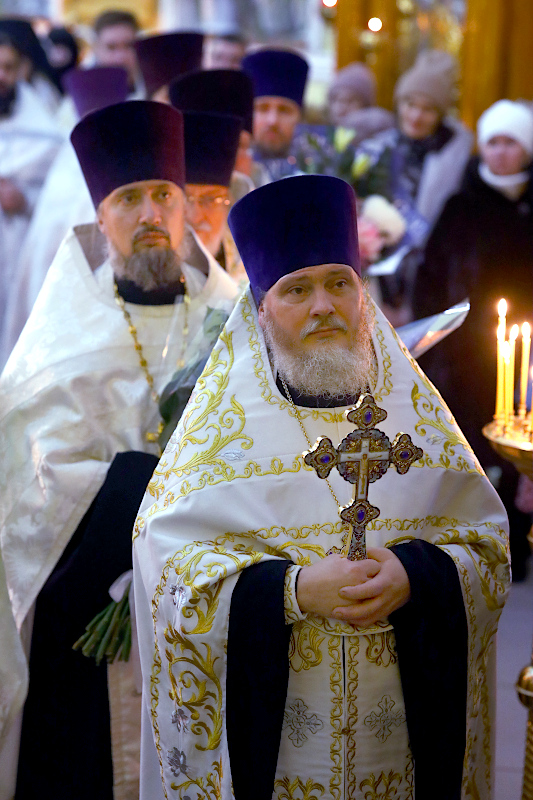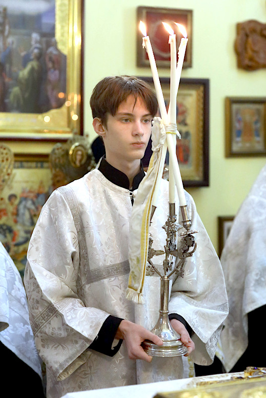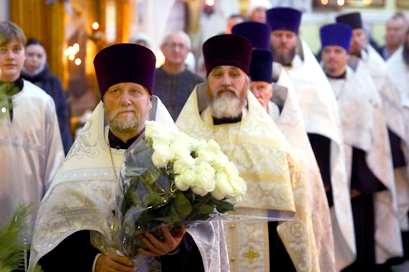 По возглашении диаконами Великого Прокимна «Кто Бог велий яко Бог наш?», Высокопреосвященнейший Владыка прочитал праздничное Евангельское Зачало 2 от Матфея: Рождение же Иисуса Христа было так: по обручении Матери Его Марии с Иосифом, прежде чем сочетались они, оказалось, что Она имеет во чреве от Духа Святого. Иосиф же, муж Ее, будучи праведен и не желая Ее обесславить, решил тайно отпустить Ее. Но когда он помыслил это, — вот, ангел Господень явился ему в сновидении и сказал: Иосиф, сын Давидов, не бойся принять Мариам, жену твою, ибо рожденное в Ней — от Духа Святого. И родит Она Сына, и наречёшь имя Ему: Иисус, ибо Он спасет народ Свой от грехов их. А это всё произошло, чтобы исполнилось сказанное Господом чрез пророка: Вот, Дева зачнет во чреве и родит Сына, и нарекут имя Ему: Еммануил, что в переводе значит: с нами Бог. Пробудившись от сна, Иосиф поступил, как повелел ему ангел Господень, и принял жену свою. И не знал Ее, доколе не родила Она Сына, и он нарек имя Ему: Иисус. (Мф. 1:18-25)