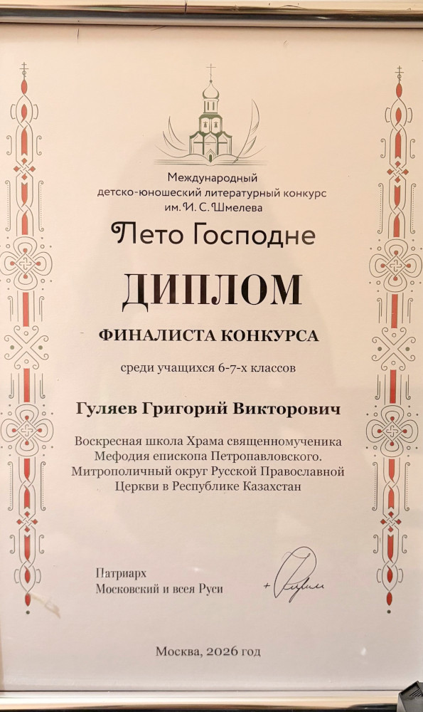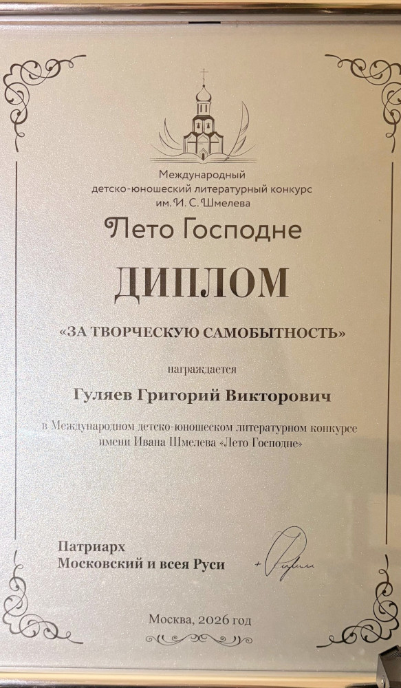 Работа по подготовке к международному детско-юношескому литературному конкурсу имени И. С Шмелева началась в конце октября 2025 года. Было выбрано одно из предложенных тематических направлений, посвященное 80-летию победы в Великой Отечественной Войне. По мнению нашего участника Гуляева Григория, война, несмотря на свою трагедию, является событием, которое вызывает интерес у людей. Предложенная им история двух братьев, которые смело сражались за Родину была отредактирована и дополнена. Во время работы в нашей воскресной школе различные возможные варианты написания текста. Проговаривались вслух перед учителями, советовались, выбирали какой больше понравиться. При описании действий одного из героев во второй половине рассказа, помогли знания и навыки Григория в занятиях греко-римской борьбой. При его несогласии с некоторыми предложениями и дополнениями текст работы оставляли без изменений. В своей окончательной редакции рассказ «Отцовский оберег» был отправлен в Москву и был там отмечен по итогам конкурса.