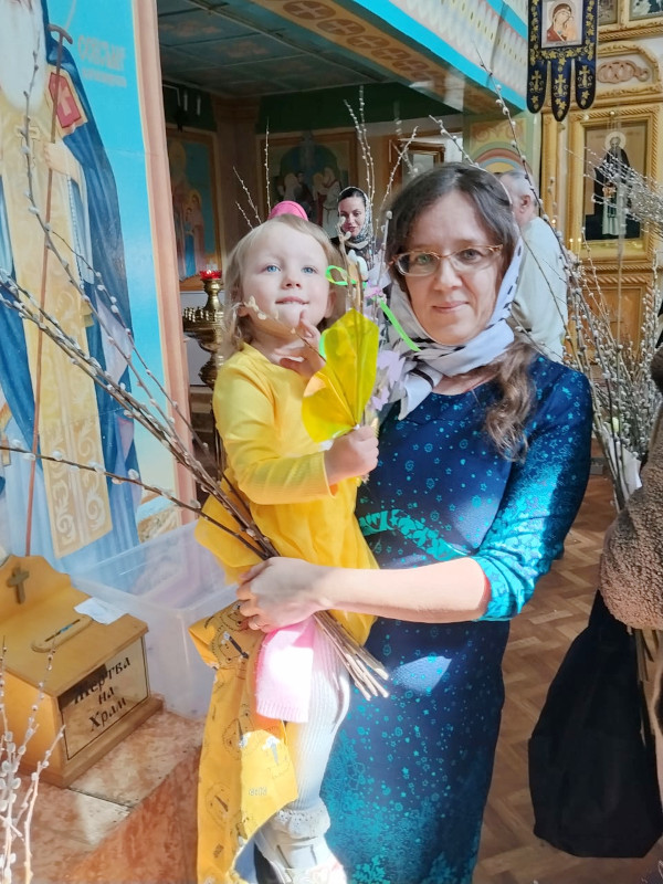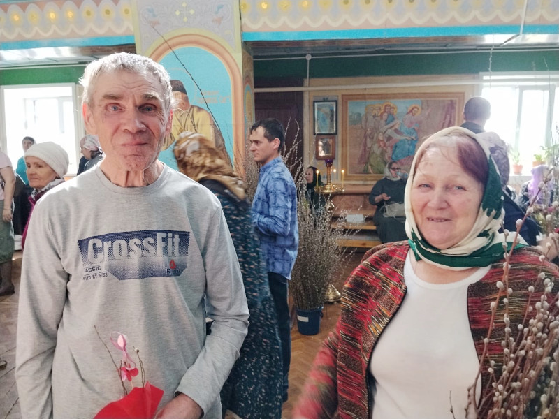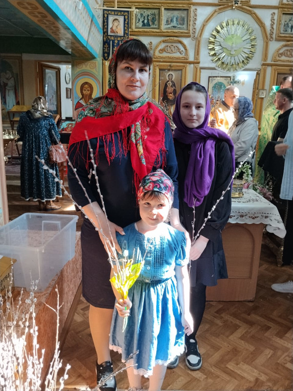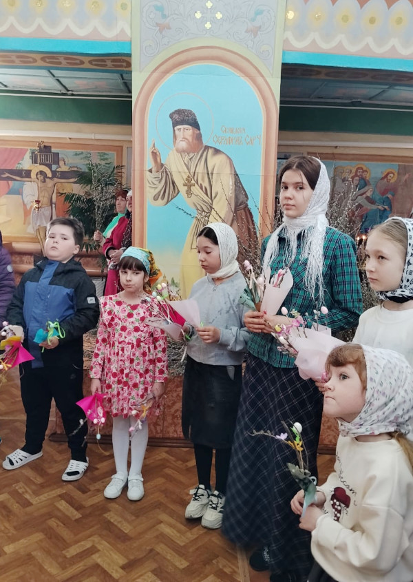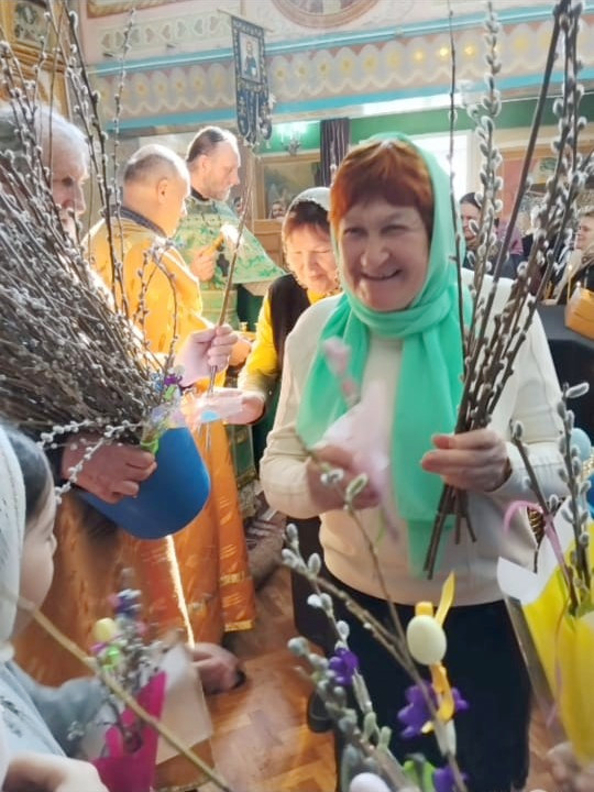 Для прихожан дети своими руками сделали букетики из верб, вкладывая в каждую поделку тепло своей души и радость праздника. Перед тем как нести в храм и освящать, вербу украшали лентами, искусственными цветами. В конце службы отец Александр освятил вербы, после чего дети с радостью подарили их прихожанам.