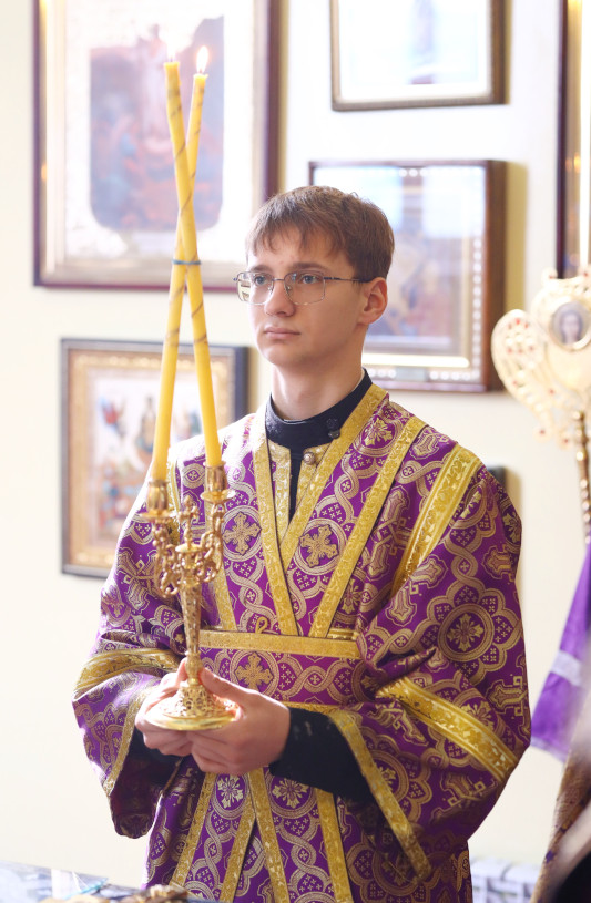На Литургии было прочитано Евангельское составное Зачало: (Матфея 26:1-20) Когда Иисус окончил все слова сии, то сказал ученикам Своим: вы знаете, что через два дня будет Пасха, и Сын Человеческий предан будет на распятие. Тогда собрались первосвященники и книжники и старейшины народа во двор первосвященника, по имени Каиафы, и положили в совете взять Иисуса хитростью и убить; но говорили: только не в праздник, чтобы не сделалось возмущения в народе. Когда же Иисус был в Вифании, в доме Симона прокаженного, приступила к Нему женщина с алавастровым сосудом мира драгоценного и возливала Ему возлежащему на голову. Увидев это, ученики Его вознегодовали и говорили: к чему такая трата? Ибо можно было бы продать это миро за большую цену и дать нищим. Но Иисус, уразумев сие, сказал им: что смущаете женщину? она доброе дело сделала для Меня: ибо нищих всегда имеете с собою, а Меня не всегда имеете; возлив миро сие на тело Мое, она приготовила Меня к погребению; истинно говорю вам: где ни будет проповедано Евангелие сие в целом мире, сказано будет в память ее и о том, что она сделала. Тогда один из двенадцати, называемый Иуда Искариот, пошел к первосвященникам и сказал: что вы дадите мне, и я вам предам Его? Они предложили ему тридцать сребреников; и с того времени он искал удобного случая предать Его. В первый же день опресночный приступили ученики к Иисусу и сказали Ему: где велишь нам приготовить Тебе пасху? Он сказал: пойдите в город к такому-то и скажите ему: «Учитель говорит: время Мое близко; у тебя совершу пасху с учениками Моими». Ученики сделали, как повелел им Иисус, и приготовили пасху. Когда же настал вечер, Он возлег с двенадцатью учениками; (Иоанна 13:3-17) Иисус, зная, что Отец все отдал в руки Его, и что Он от Бога исшел и к Богу отходит, встал с вечери, снял с Себя верхнюю одежду и, взяв полотенце, препоясался. Потом влил воды в умывальницу и начал умывать ноги ученикам и отирать полотенцем, которым был препоясан. Подходит к Симону Петру, и тот говорит Ему: Господи! Тебе ли умывать мои ноги? Иисус сказал ему в ответ: что Я делаю, теперь ты не знаешь, а уразумеешь после. Петр говорит Ему: не умоешь ног моих вовек. Иисус отвечал ему: если не умою тебя, не имеешь части со Мною. Симон Петр говорит Ему: Господи! не только ноги мои, но и руки и голову. Иисус говорит ему: омытому нужно только ноги умыть, потому что чист весь; и вы чисты, но не все. Ибо знал Он предателя Своего, потому и сказал: не все вы чисты. Когда же умыл им ноги и надел одежду Свою, то, возлегши опять, сказал им: знаете ли, что Я сделал вам? Вы называете Меня Учителем и Господом, и правильно говорите, ибо Я точно то. Итак, если Я, Господь и Учитель, умыл ноги вам, то и вы должны умывать ноги друг другу. Ибо Я дал вам пример, чтобы и вы делали то же, что Я сделал вам. Истинно, истинно говорю вам: раб не больше господина своего, и посланник не больше пославшего его. Если это знаете, блаженны вы, когда исполняете. (Матфея 26:21-39) и когда они ели, сказал: истинно говорю вам, что один из вас предаст Меня. Они весьма опечалились, и начали говорить Ему, каждый из них: не я ли, Господи? Он же сказал в ответ: опустивший со Мною руку в блюдо, этот предаст Меня; впрочем Сын Человеческий идет, как писано о Нем, но горе тому человеку, которым Сын Человеческий предается: лучше было бы этому человеку не родиться. При сем и Иуда, предающий Его, ск